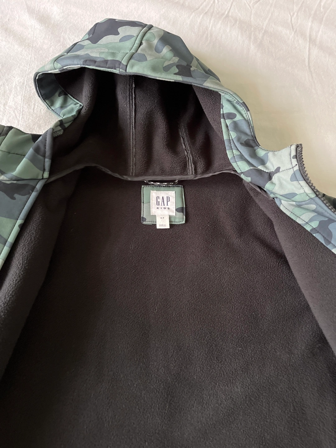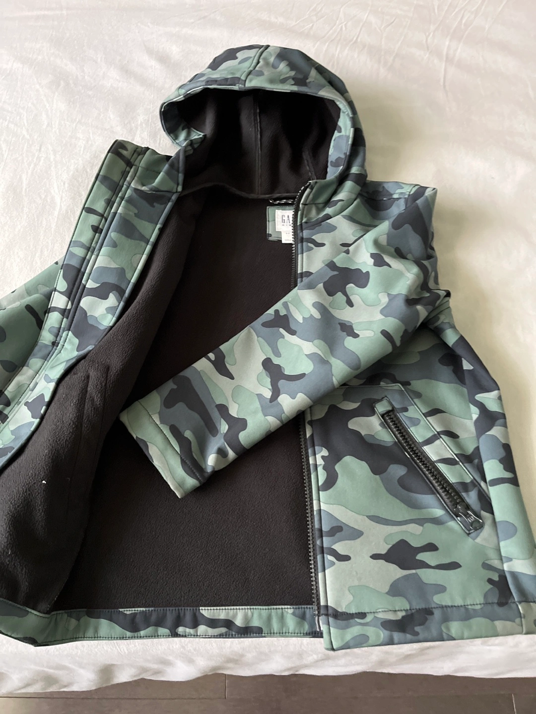 Camouflage print softshell jacket. Features a zip front closure, hood, and two zippered pockets. Soft fleece lining. Never worn.
