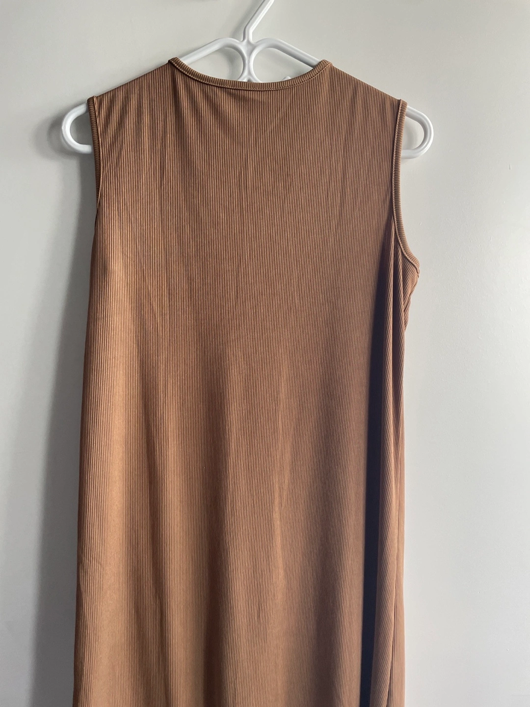 Stylish brown midi dress. Features a ribbed texture and a unique cutout detail at the neckline. Sleeveless design. Perfect for a variety of occasions.