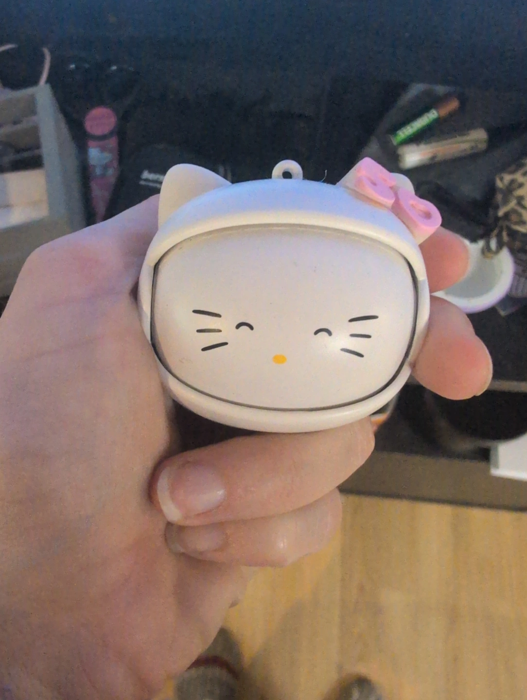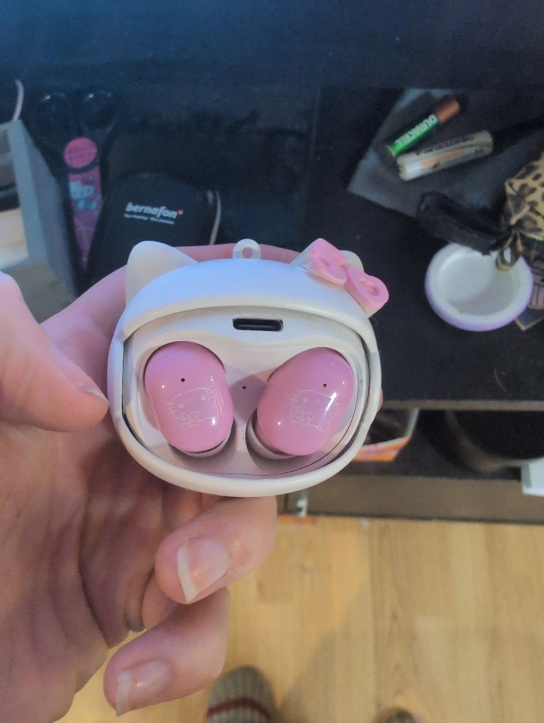 Adorable Hello Kitty-themed r wireless earbuds. Pink and white colour scheme. Compact and portable design. Perfect for protecting your earbuds.