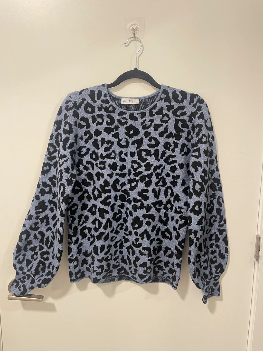 Cute blue and black leopard print sweater. Long sleeves with balloon cuffs. Crew neck. Soft knit material. Perfect for fall or winter.