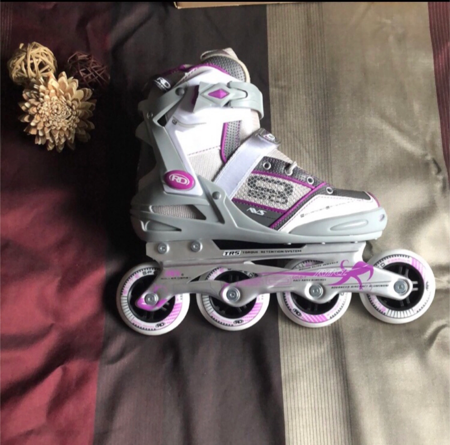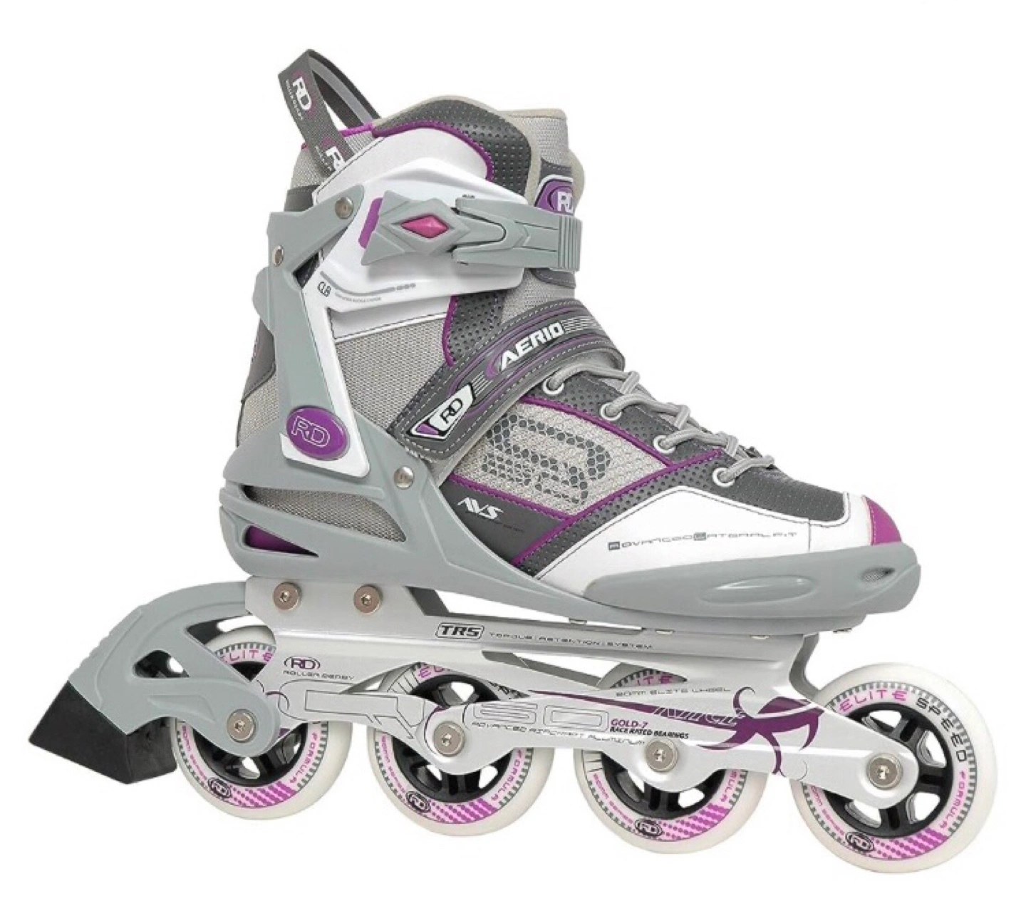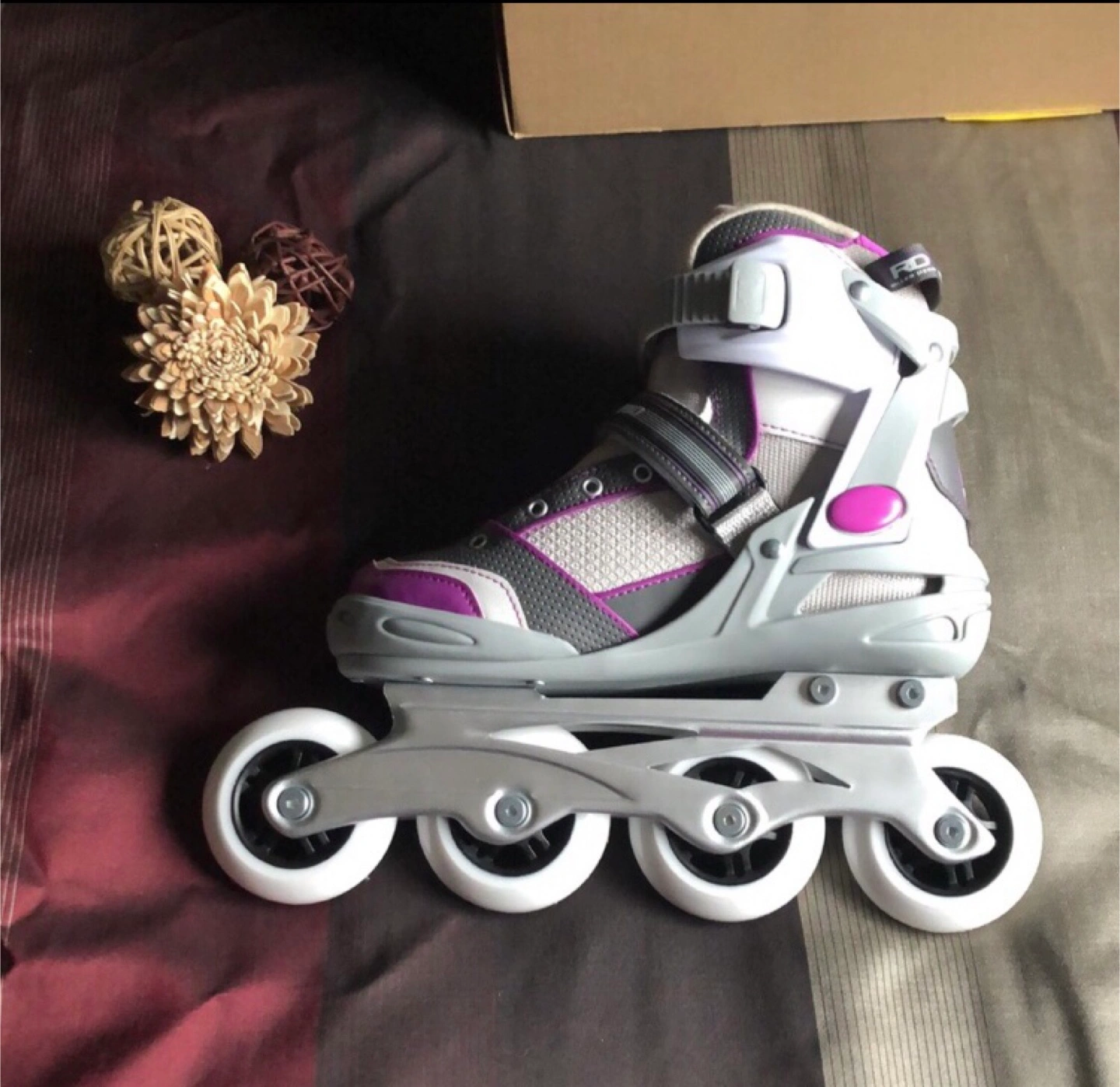 Women's inline skates, grey, purple, and white. Brand new with tags and in box. Adjustable closure system. TRS frame. Lightweight design. Fits on the smaller side