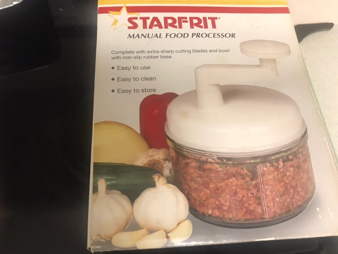 50New New Manual food processor. Extra-sharp cutting blades and bowl. Non-slip rubber base. Easy to use, clean, and store.