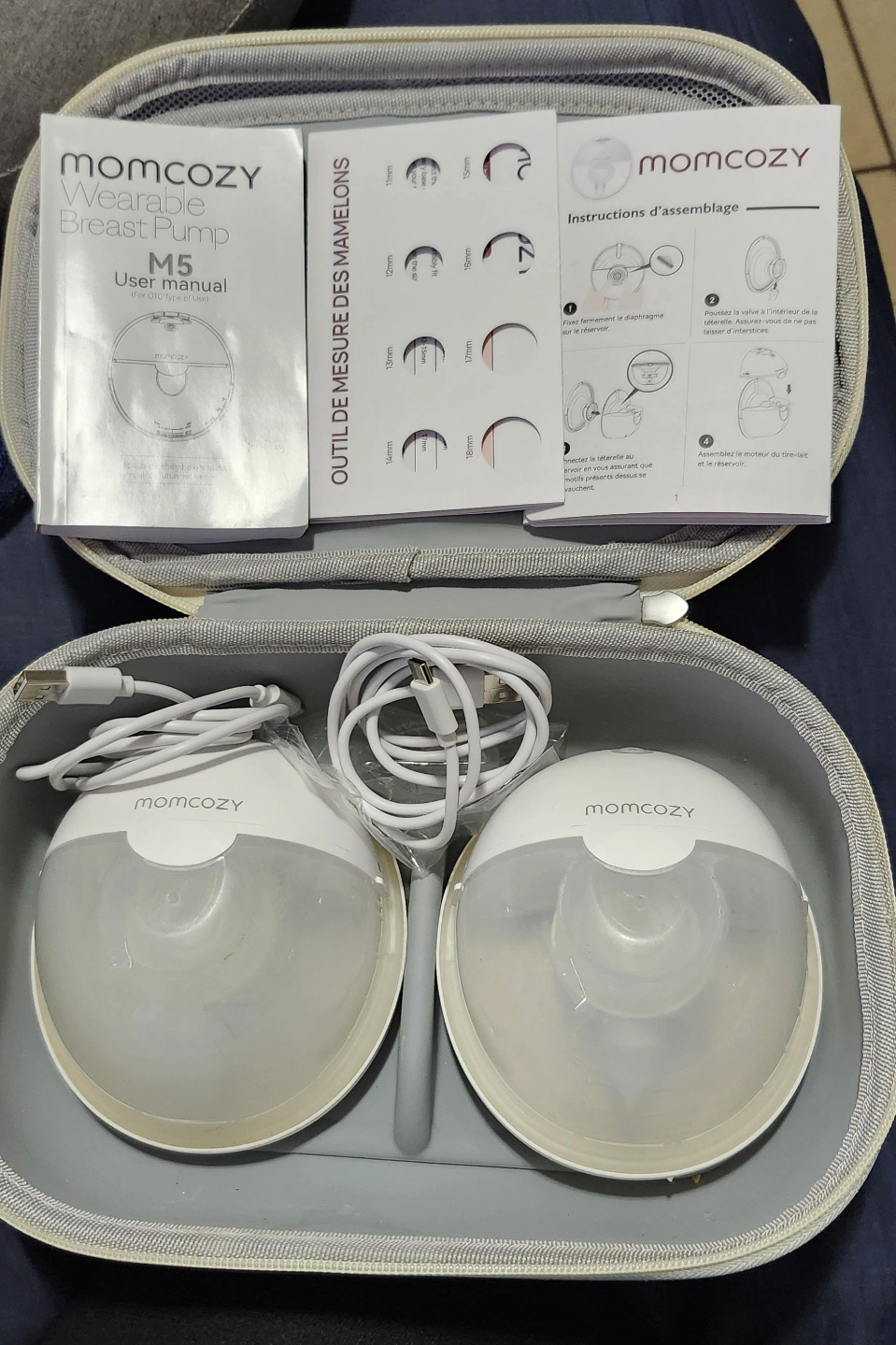 Double electric breast pump. Includes carrying case, user manual, and charging cables.