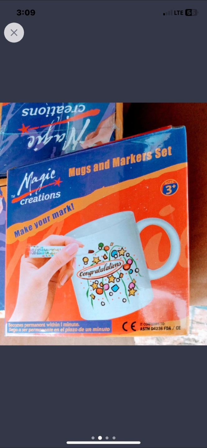 New, unopened Magic Creations mug and marker sets. Includes one blank mug and six permanent markers. Microwave safe, hand wash only. Fun and easy to use! KIDS LOVE MAKING MOM A PERSONALIZED GIFT !!!