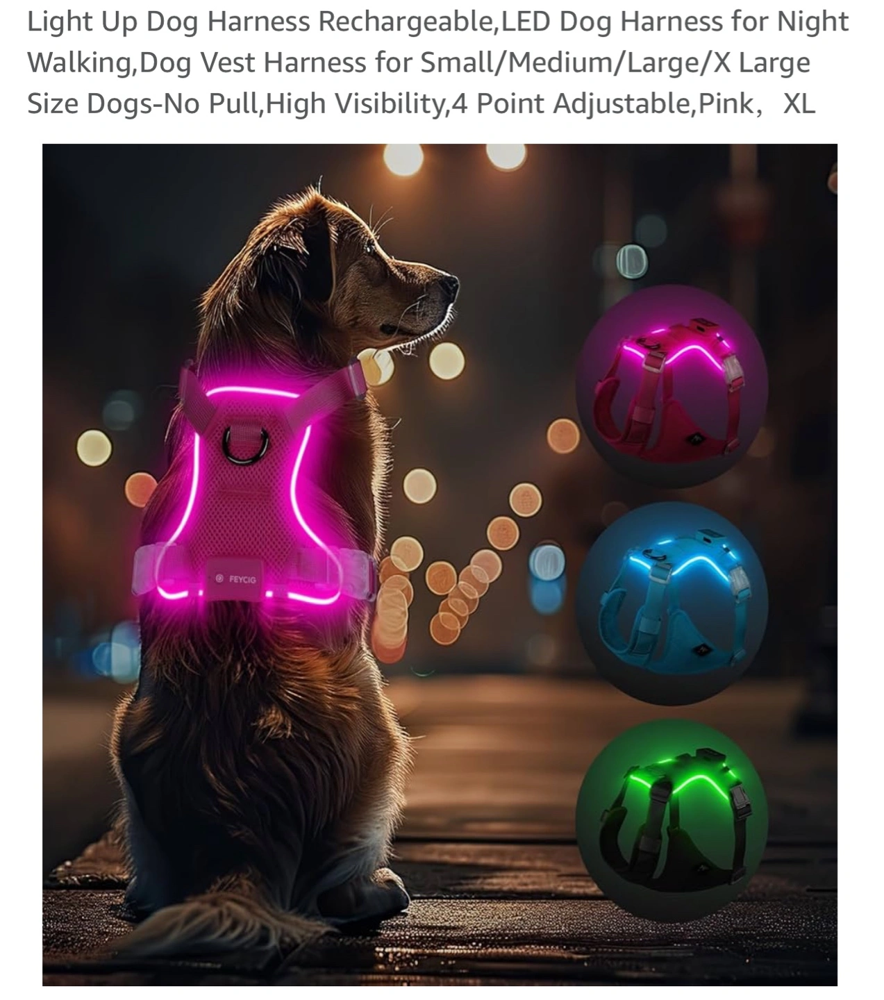 Rechargeable LED dog harness. Four-point adjustable. Pink, size XL. Three flashing modes: slow, quick, and steady. Type-C rechargeable. No-pull design. Great for night walking.