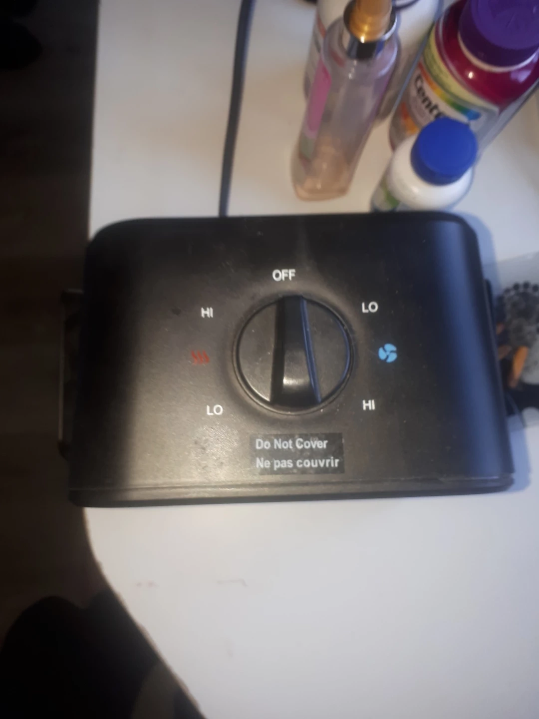 Small, black, portable ceramic heater. Features adjustable thermostat with high and low settings, plus fan only option. Oscillating function. Good for small spaces. Used condition.