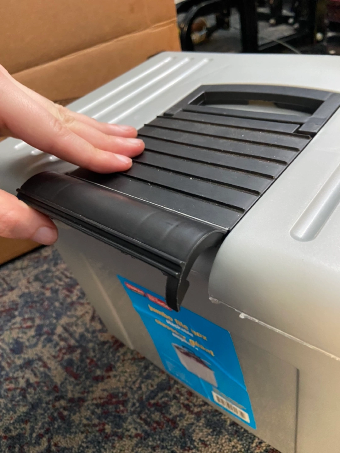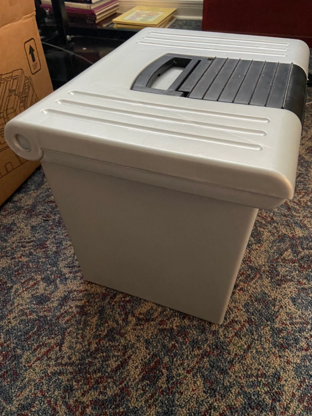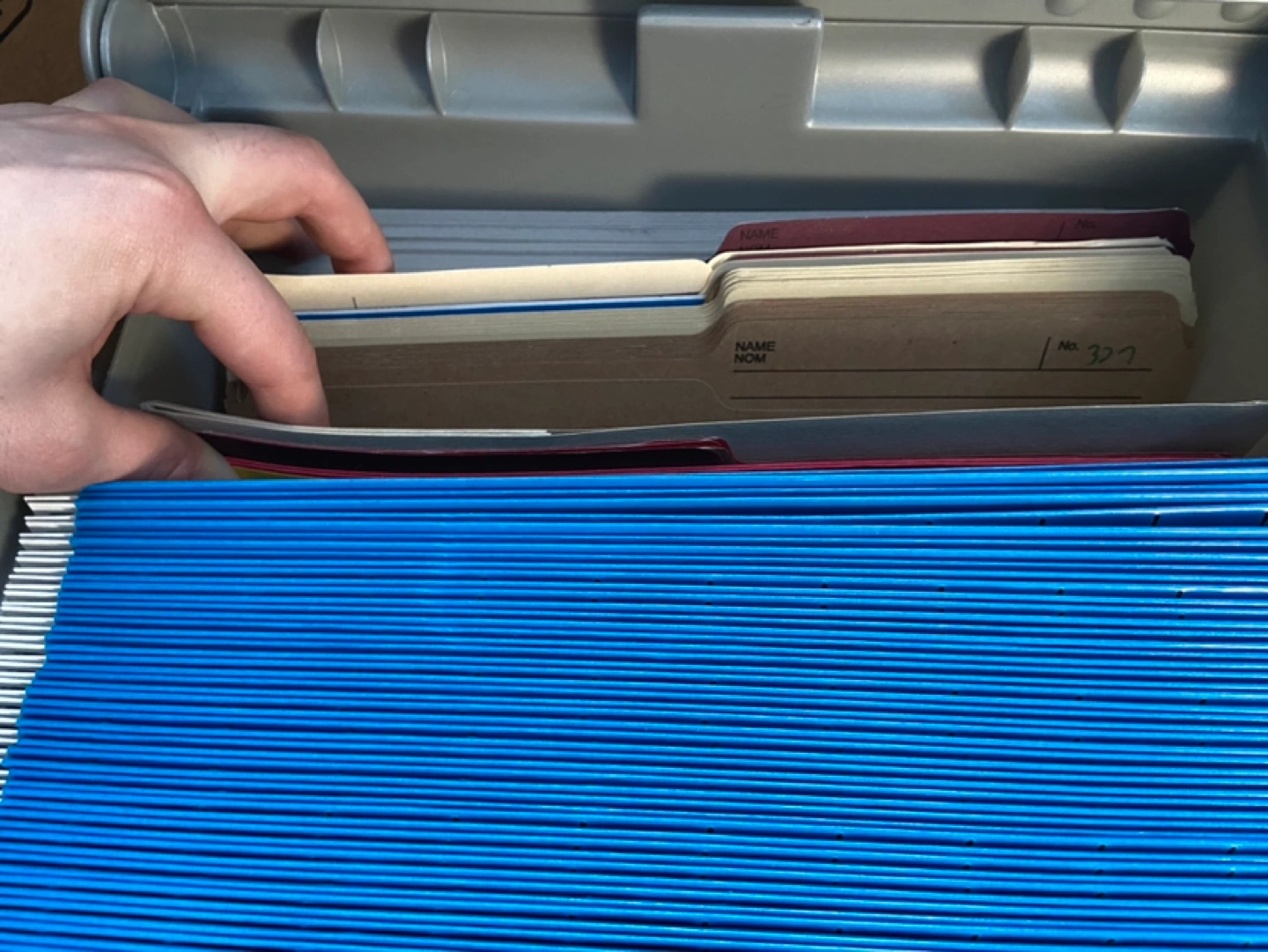 Large grey plastic file box. Includes many blue hanging file folders and several exercise books. Stackable design. Perfect for organizing documents.
