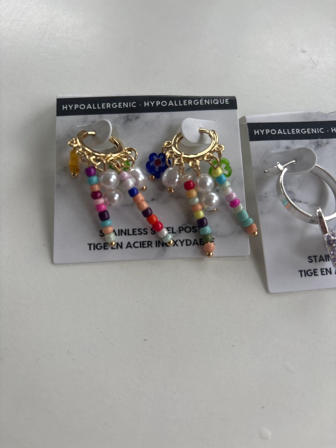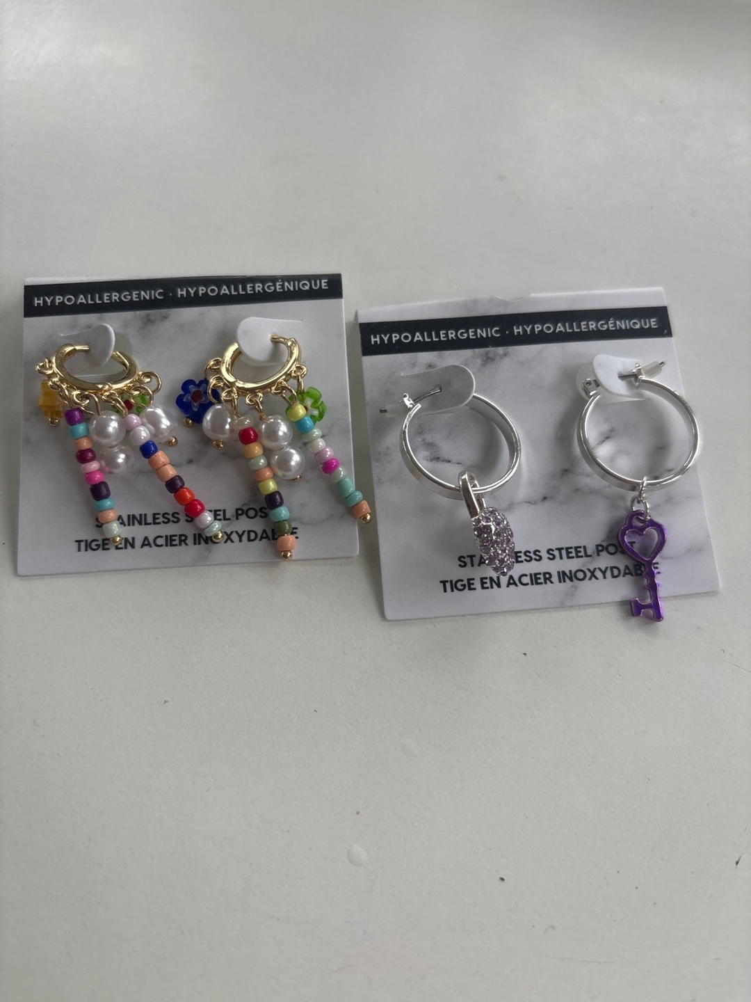 One pair features rainbow beads and pearls, the other has purple accents, lock and key