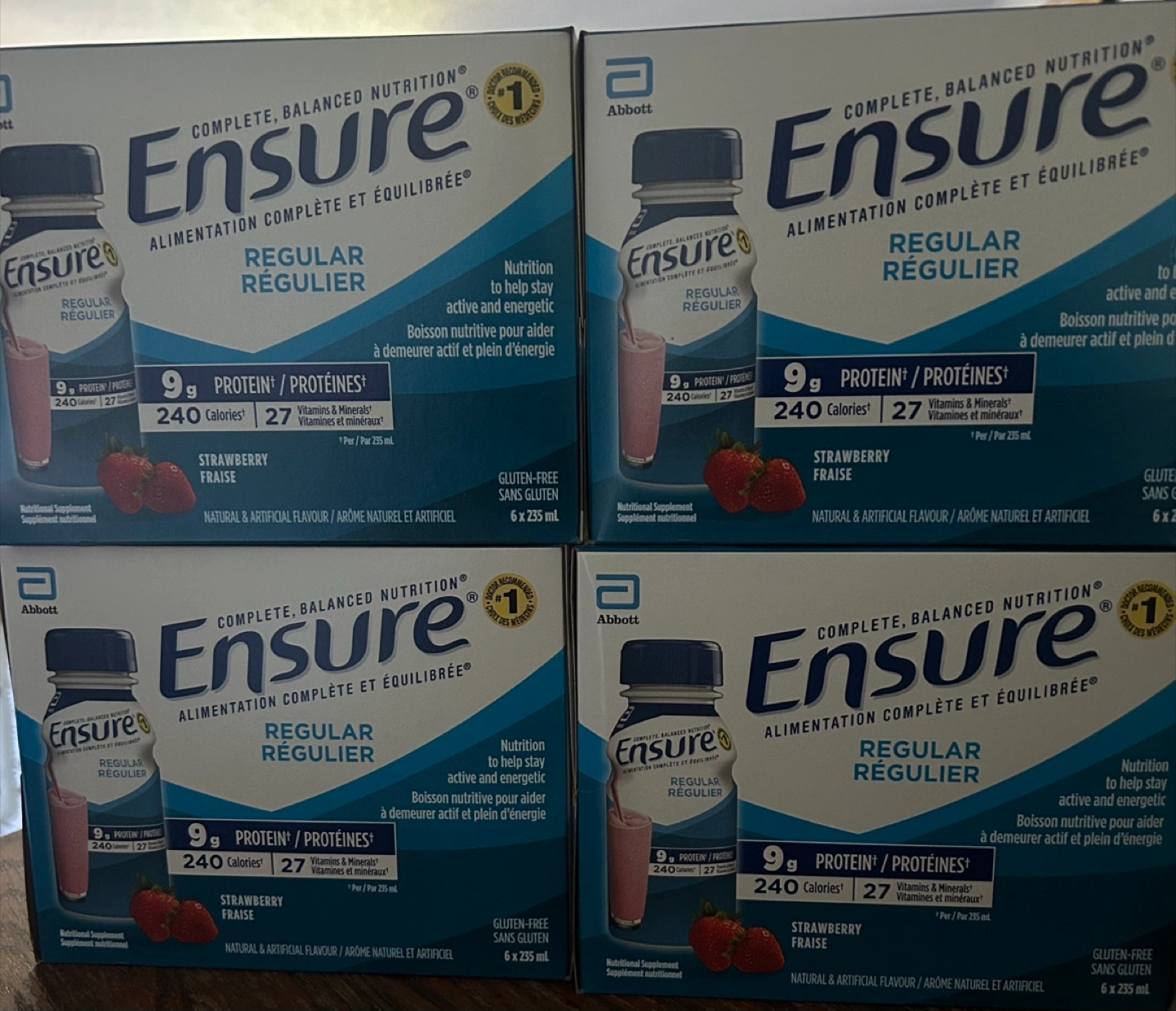 Four boxes of Ensure Regular Strawberry nutritional shakes. Each box contains six 235ml bottles. Gluten-free. Natural and artificial flavour.