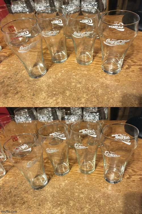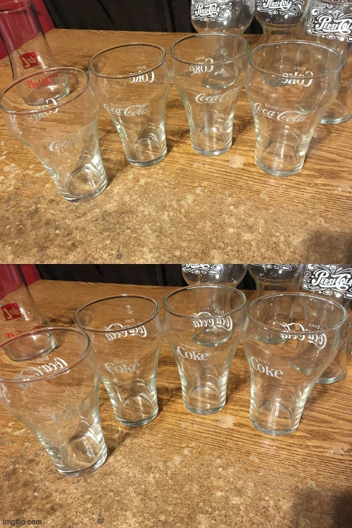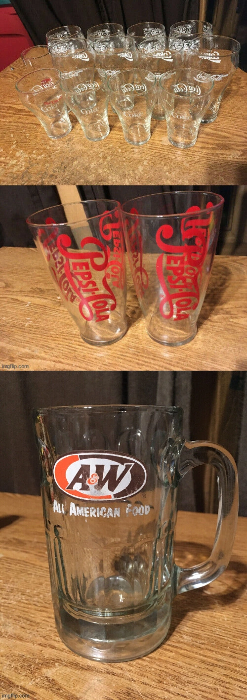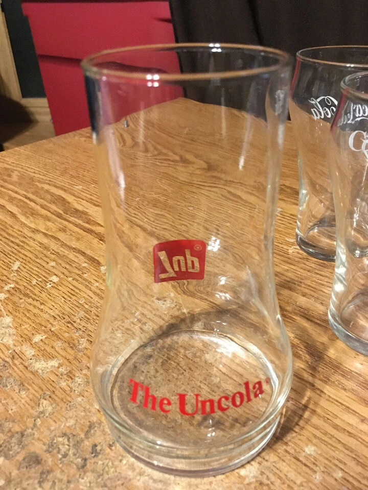 four normal sized drink Coke, four smaller size drink Coke, four Pepsi cola, one 7up the uncola, two Pepsi-Cola jumbo 30 oz glasses, one a&w root beer heavy glass 6 in all American food dimpled ribbed weighs about 2 lb cups all in great condition a&w has somewhere on it. pick up at house