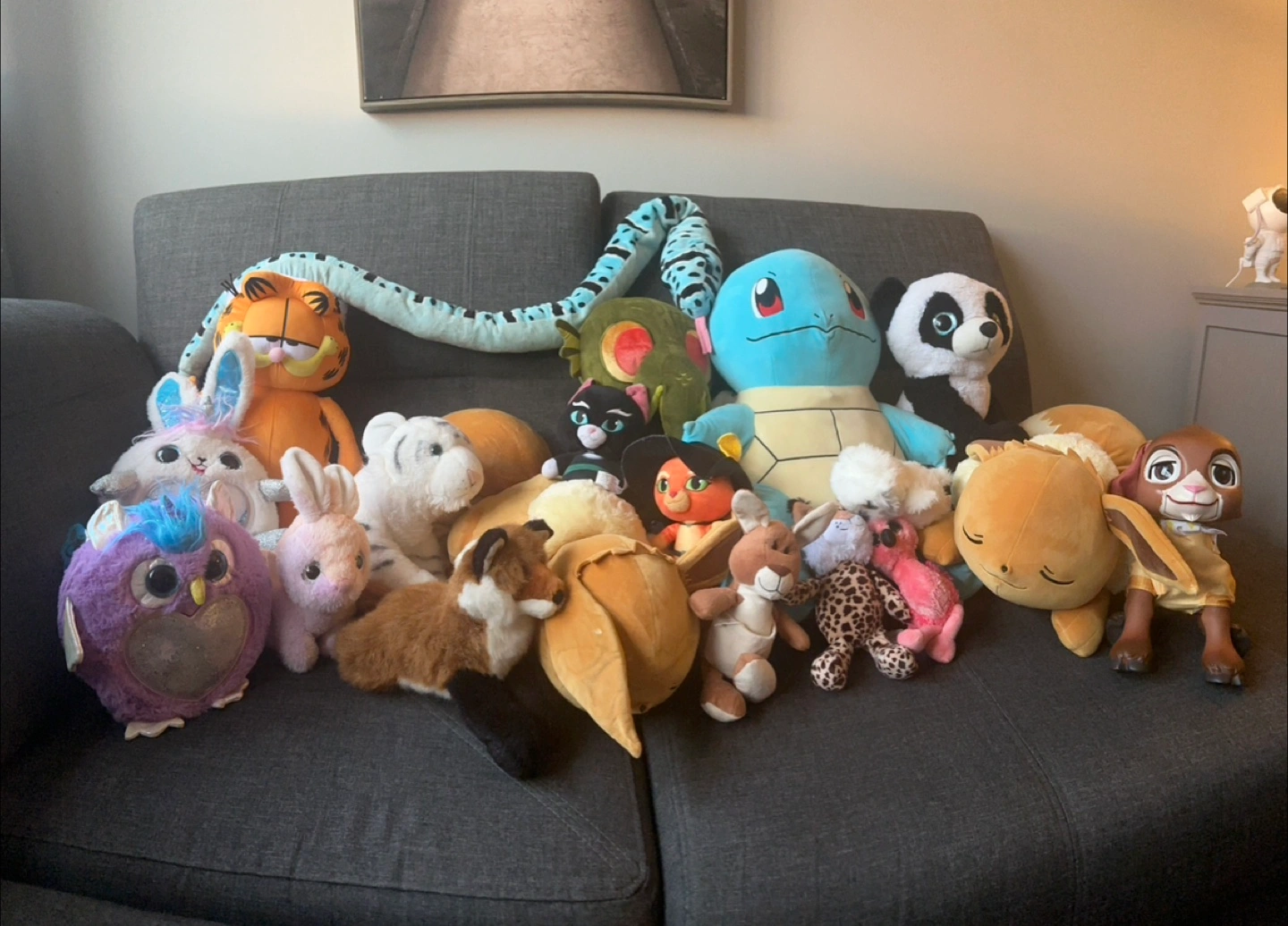 Large collection of various plush toys. Includes Pokémon, Garfield, and other characters. Many different sizes and styles. Great for collectors or kids!