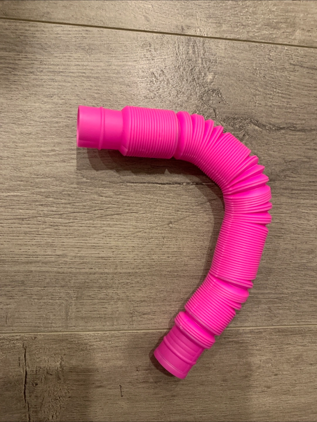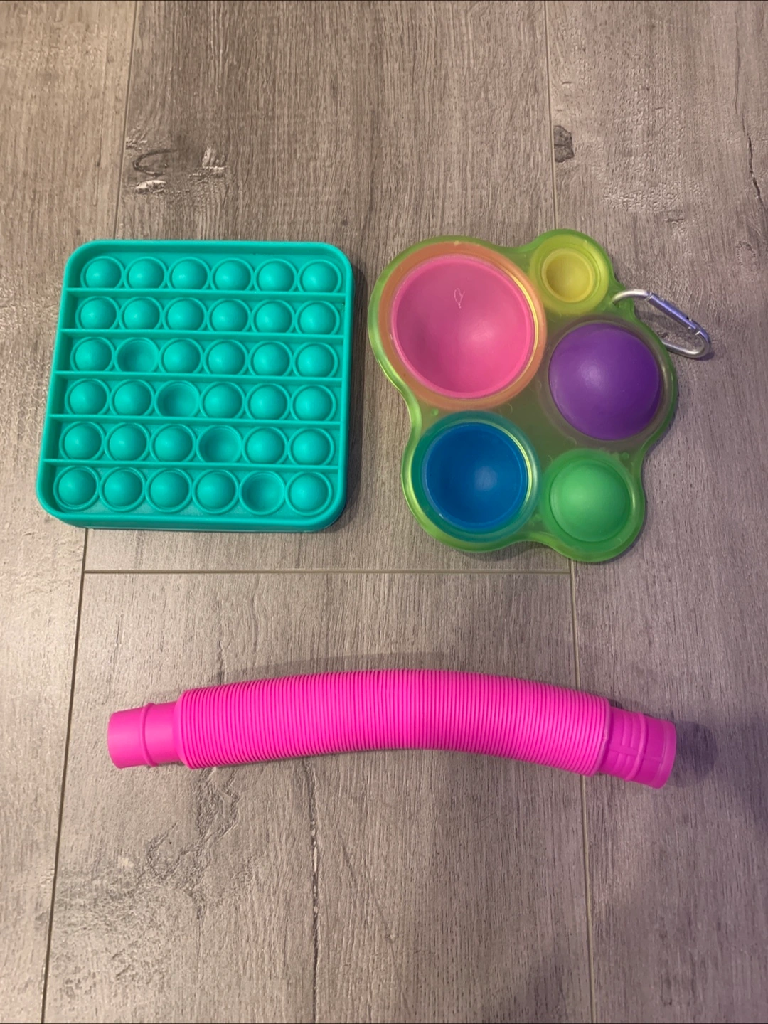 Three sensory toys. Teal square pop-it. Multicoloured dimpled ball fidget. Pink flexible tube. Great for stress relief.