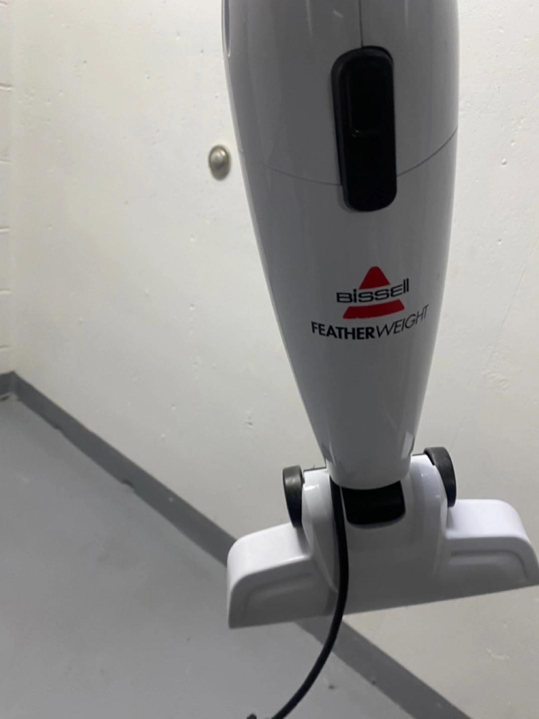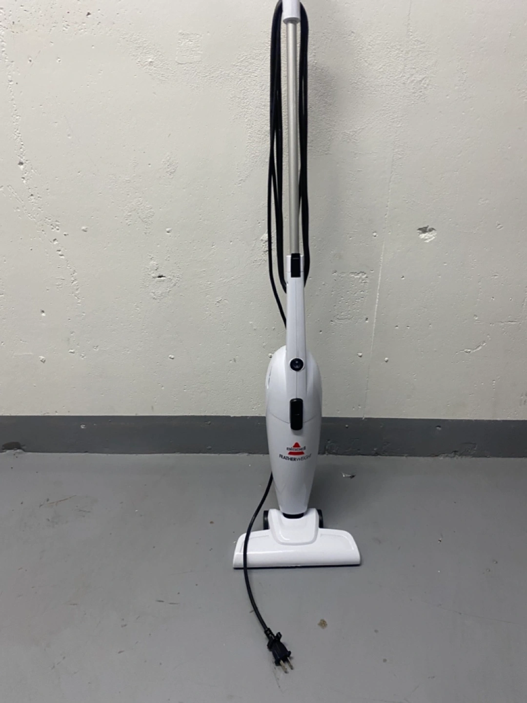 Lightweight stick vacuum, ideal for quick cleanups. Corded electric model. Features a simple on/off switch.