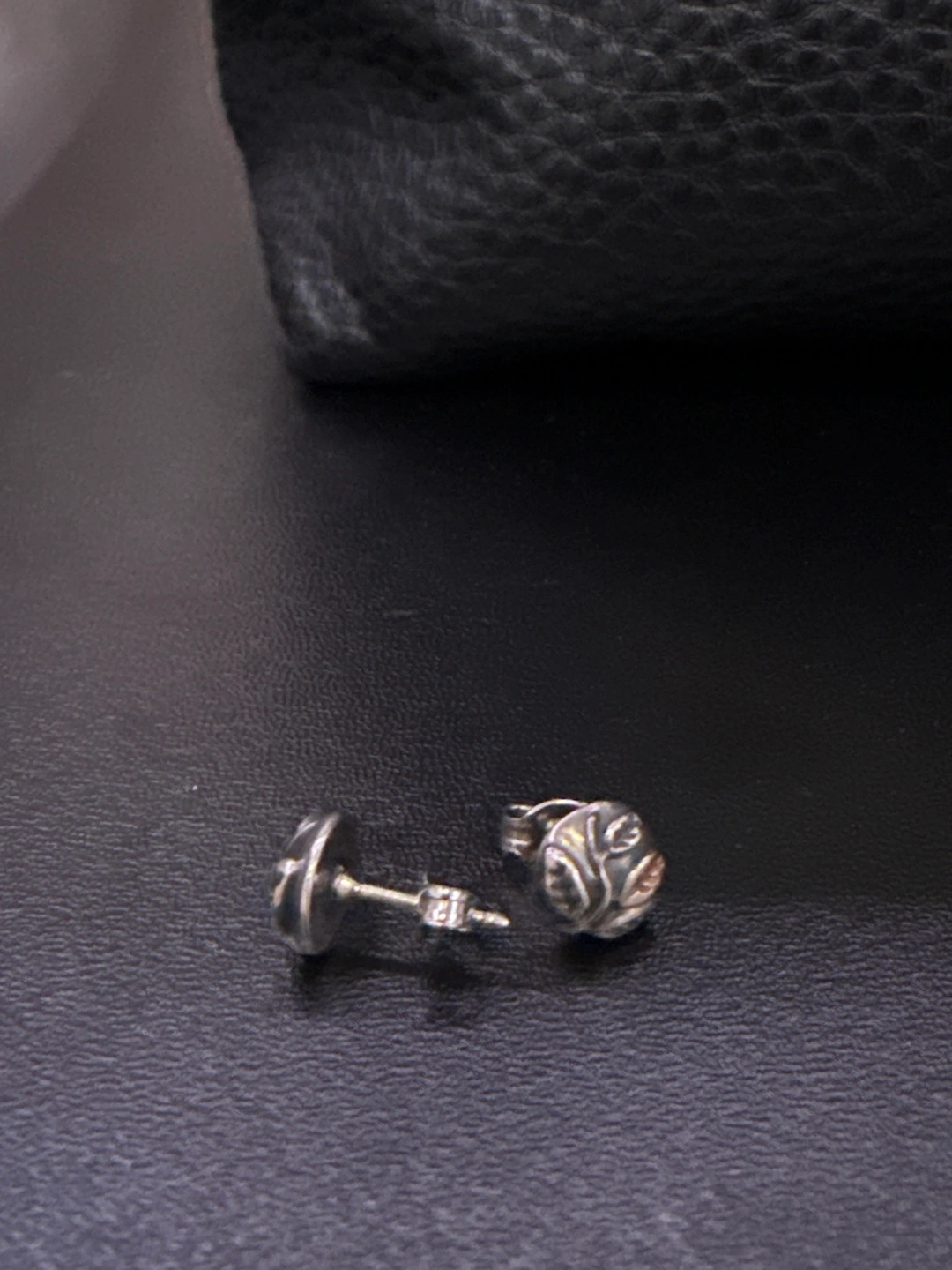 Pair of sterling silver stud earrings. Small, round design featuring leaves. Post closure.