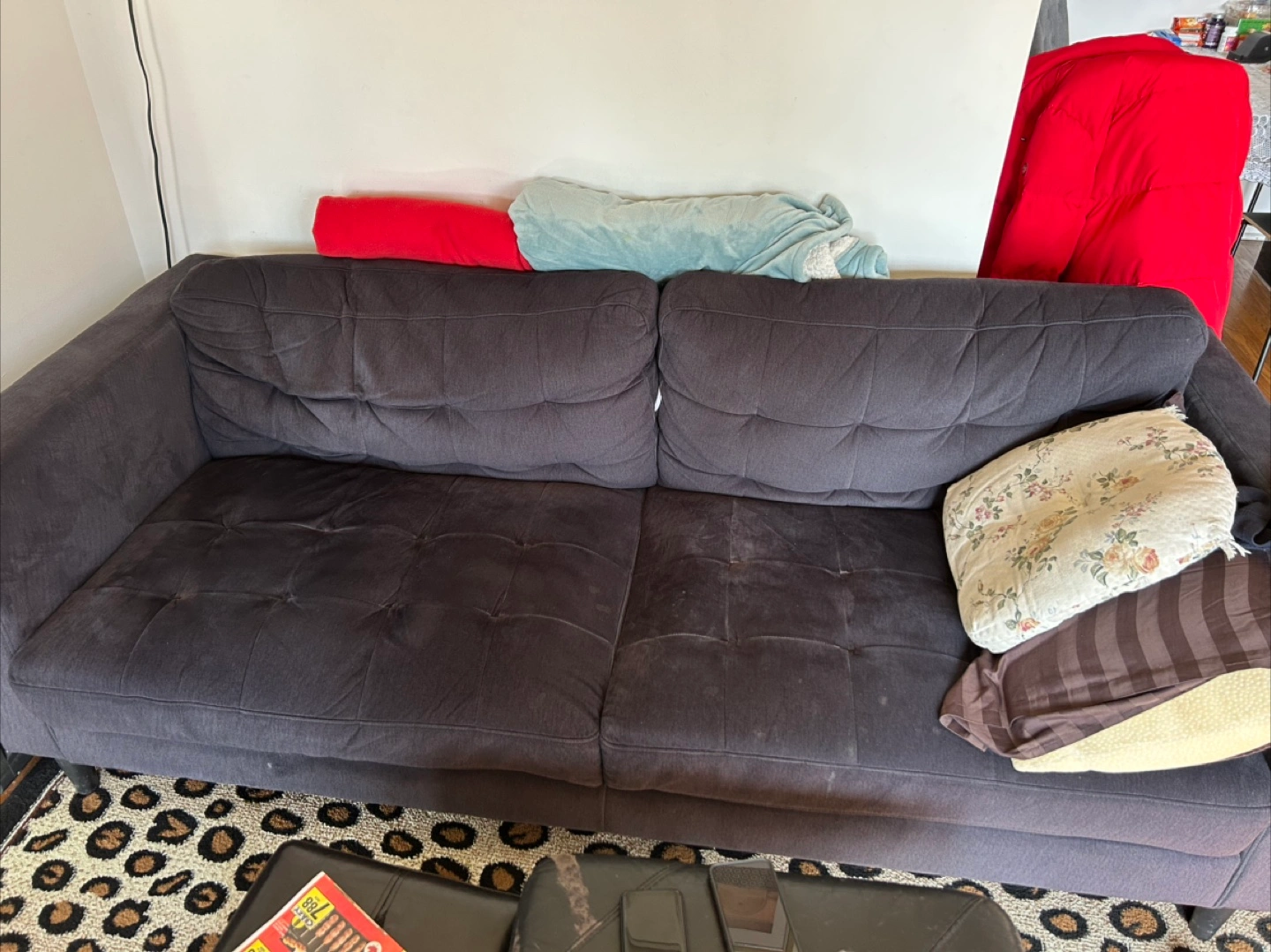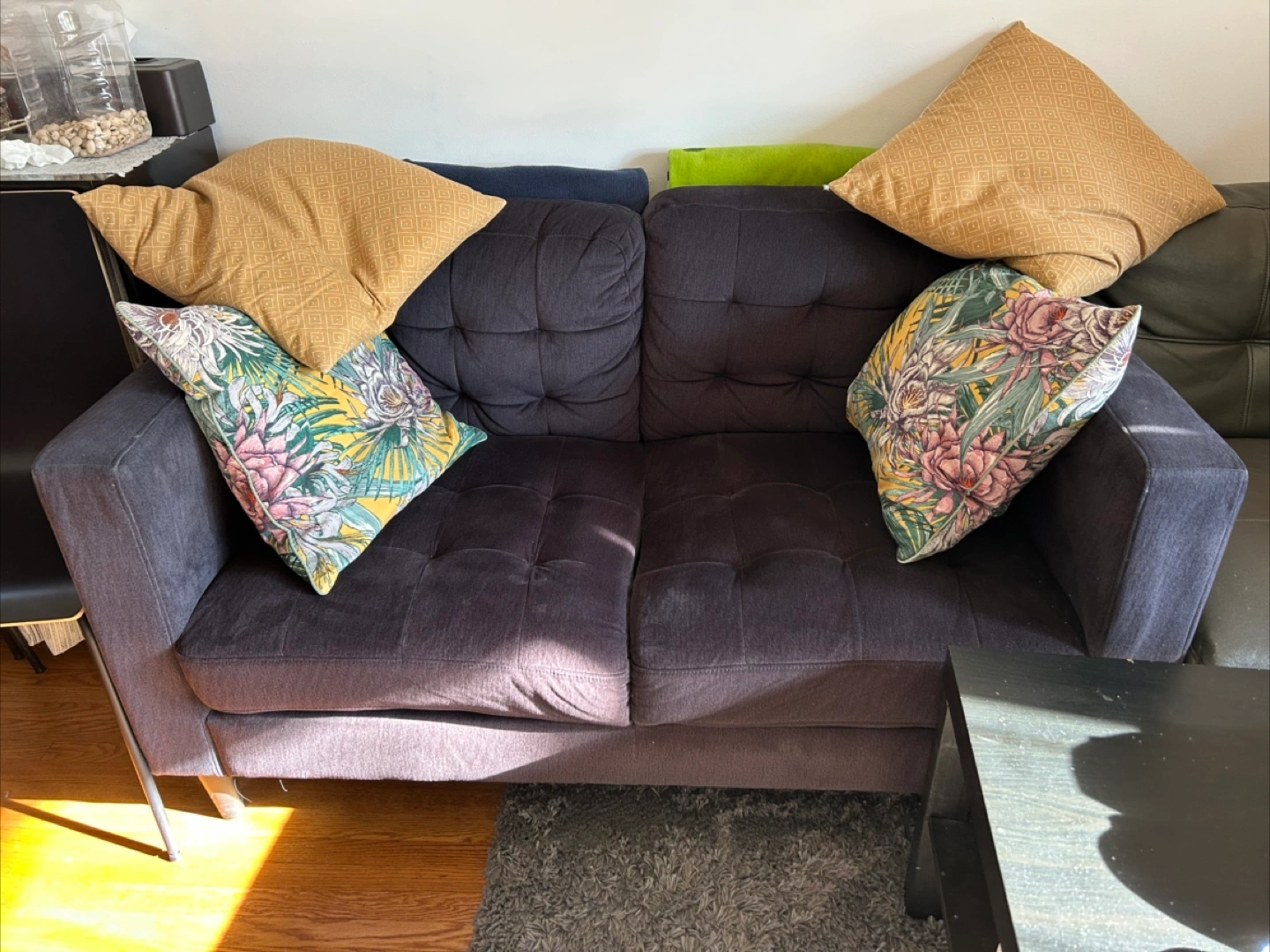 Two-seater and 3 seater sofa. Dark grey fabric upholstery. Button tufting. Straight arms. Good for small spaces. Minor wear. Very good condition. Pet and smoke free $600 for 3 seater $400 for 2 seater