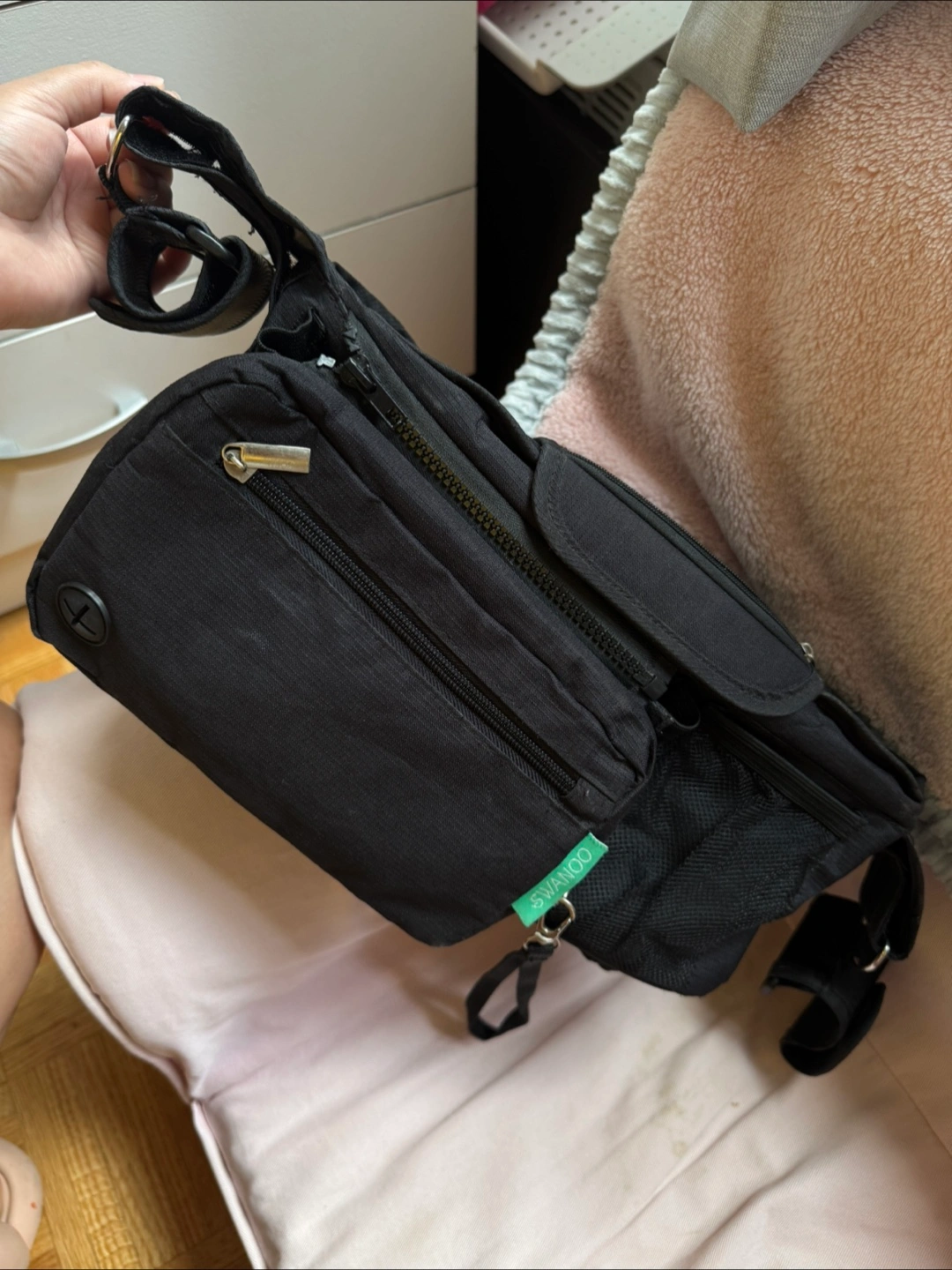 Black stroller caddy bag. Multiple pockets and zippers. Adjustable shoulder strap. Great for baby essentials.