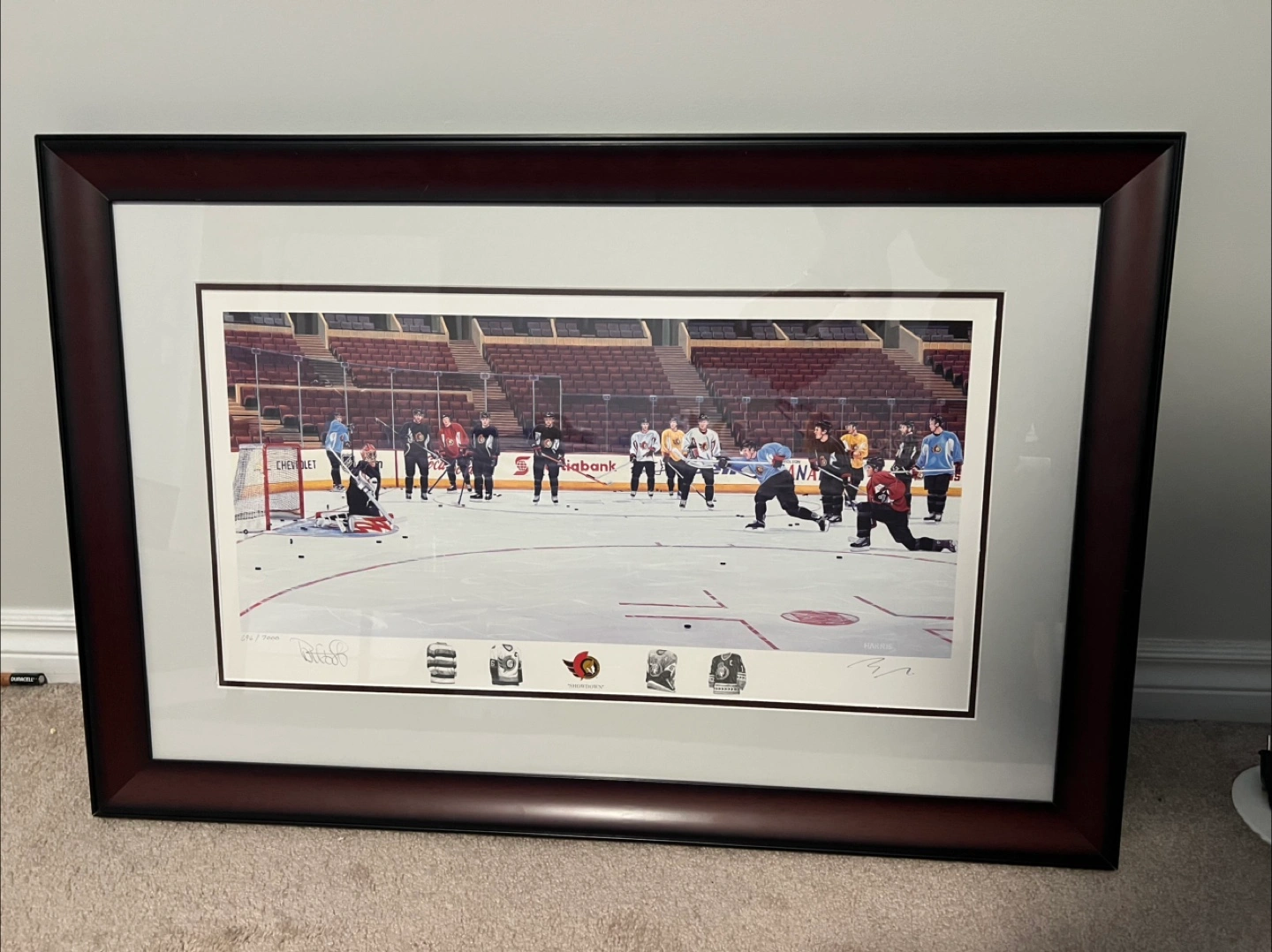 49Framed Ottawa Senators Hockey Team Practice Print Large framed print depicting the Ottawa Senators practicing. Features multiple signatures and team jersey images at the bottom. Professional framing. Pick up in Stittsville or Orleans Please check out my other ads as I continue to go through my late wife’s & father’s estates.