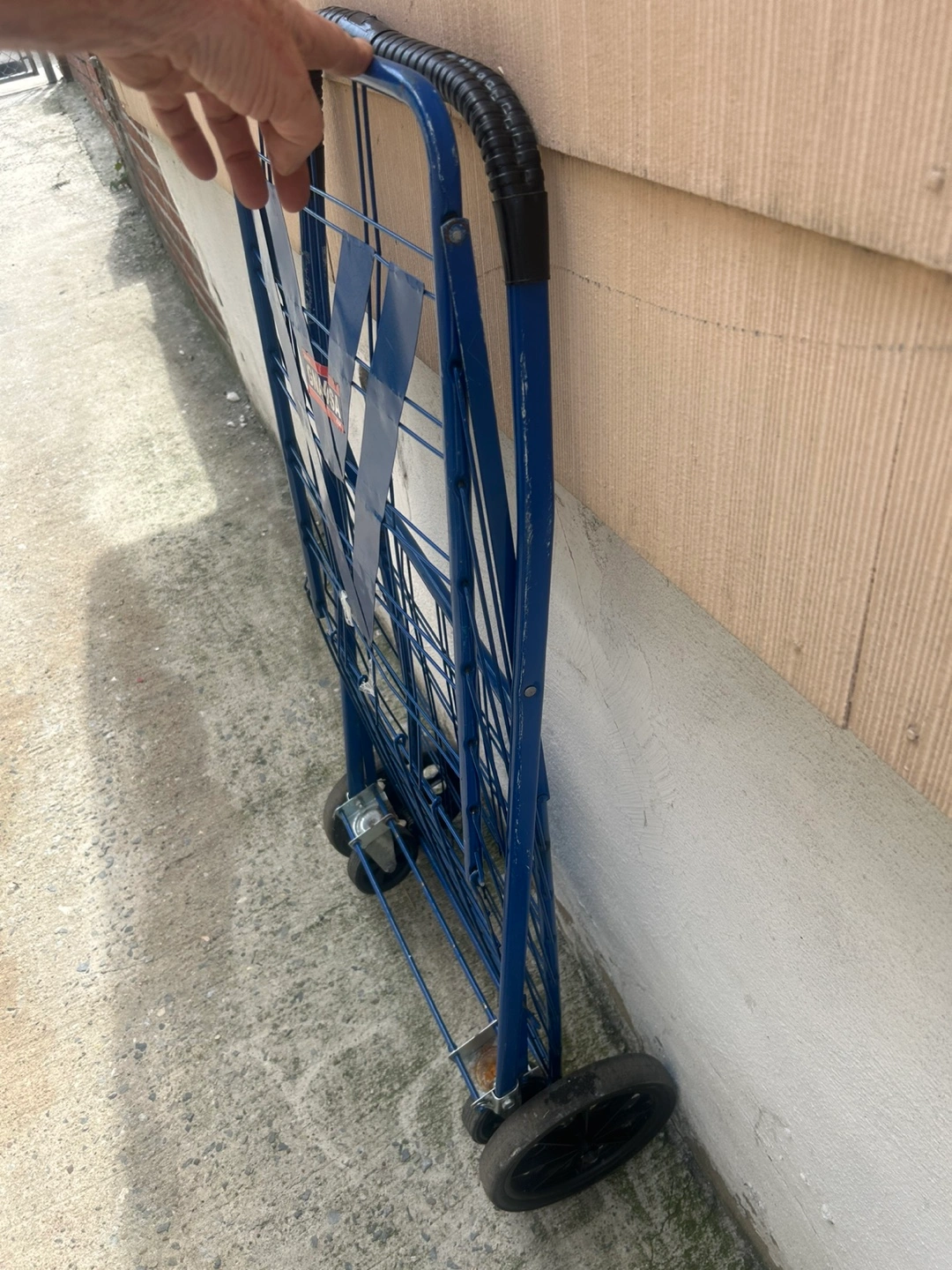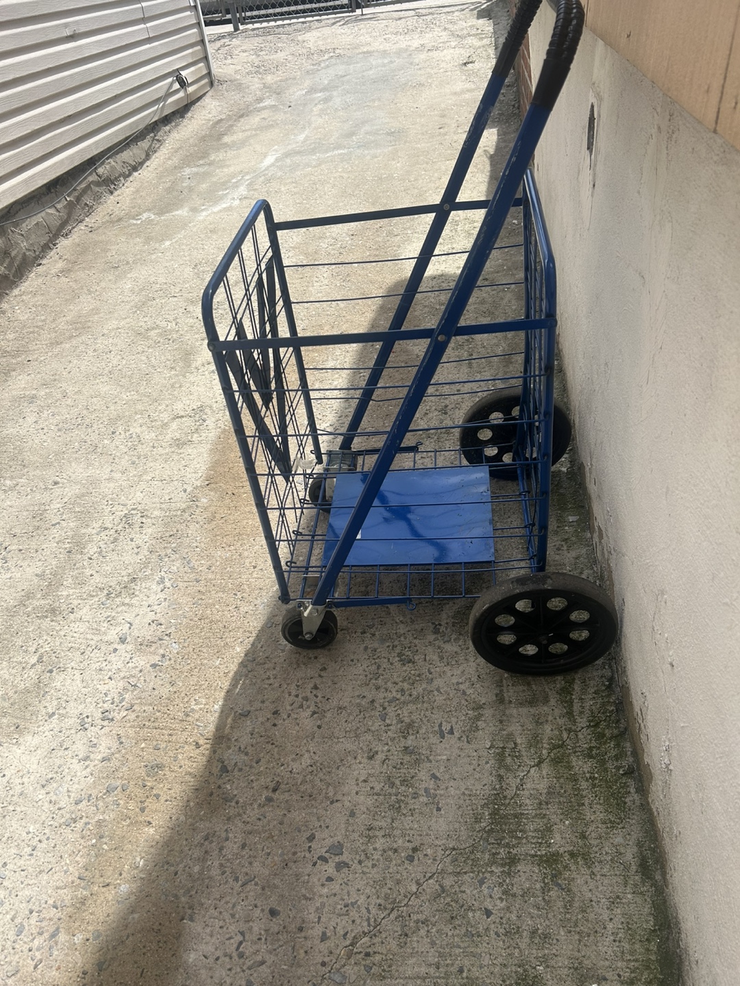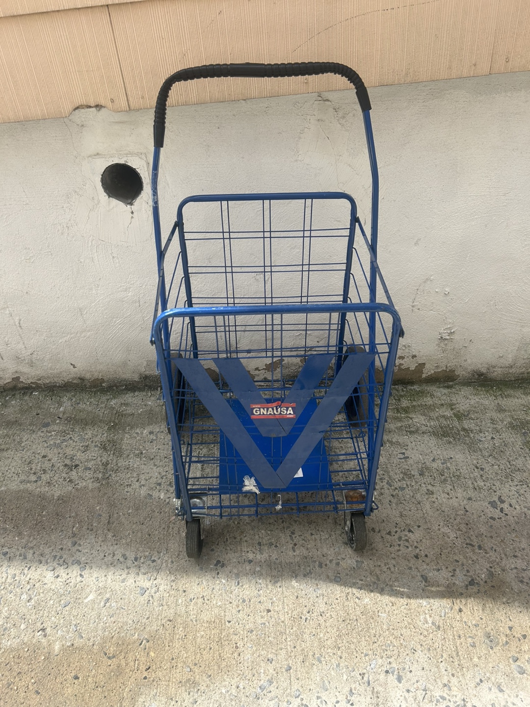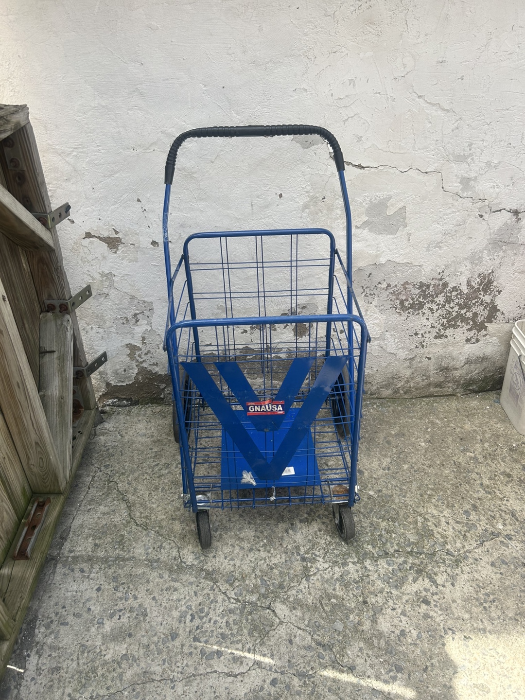 Foldable metal shopping cart. Blue color. Four wheels. Sturdy handle. Great for groceries or hauling.Full Size With articulating front wheels