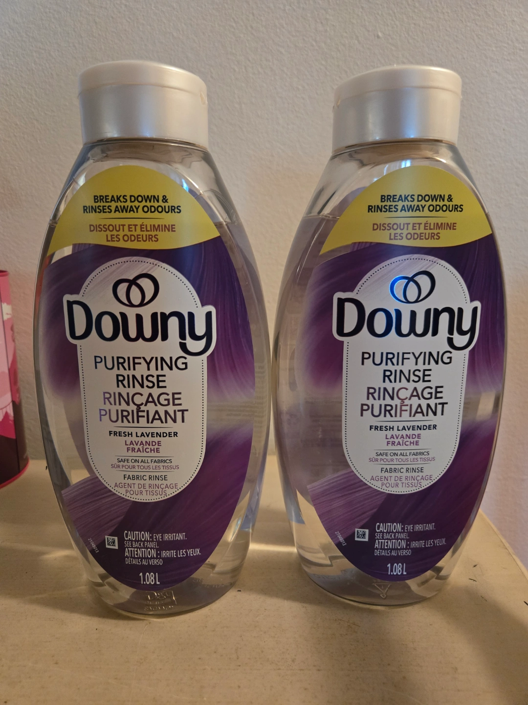 Two bottles of Downy Purifying Rinse in Fresh Lavender scent. 1.08L each. Breaks down and rinses away odours. Safe on all fabrics.