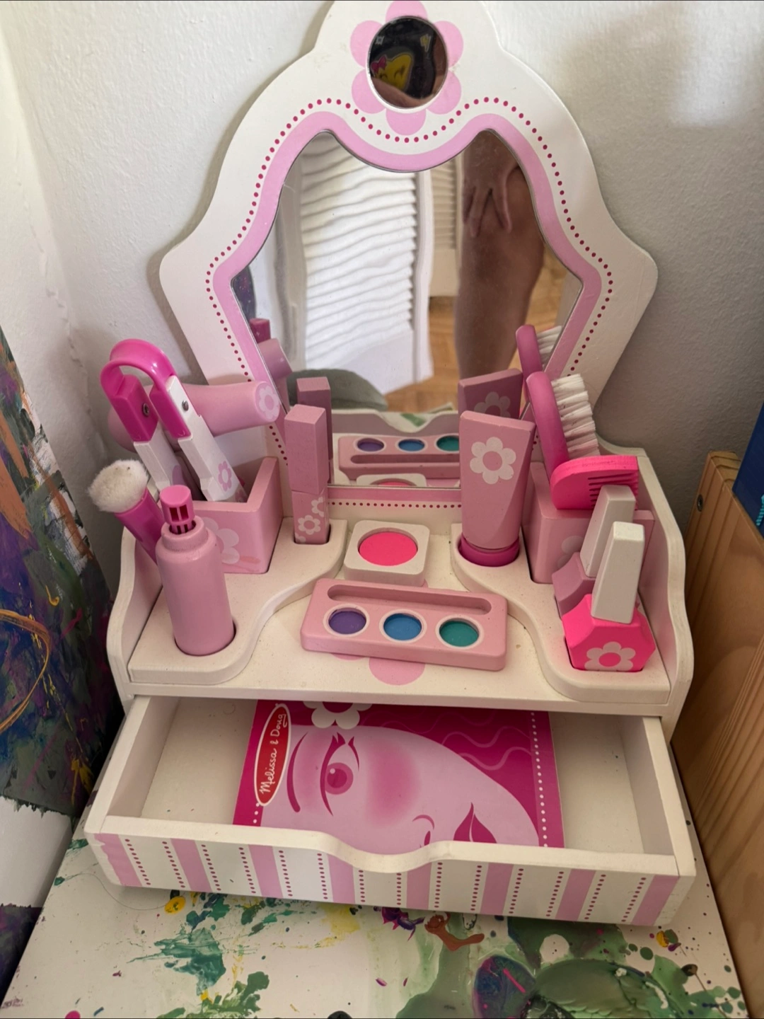Adorable pink vanity set. Includes mirror, various pretend makeup accessories, and a drawer. Great for imaginative play.
