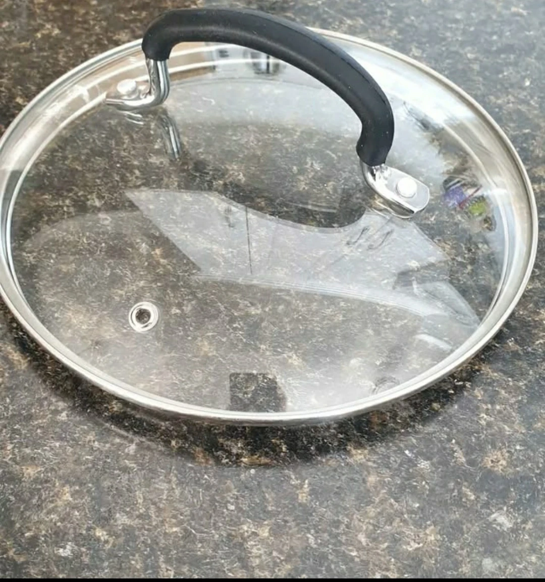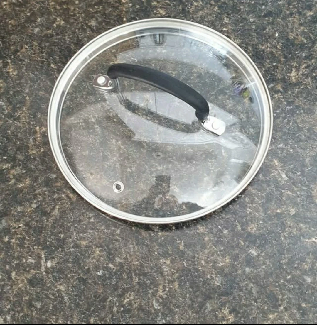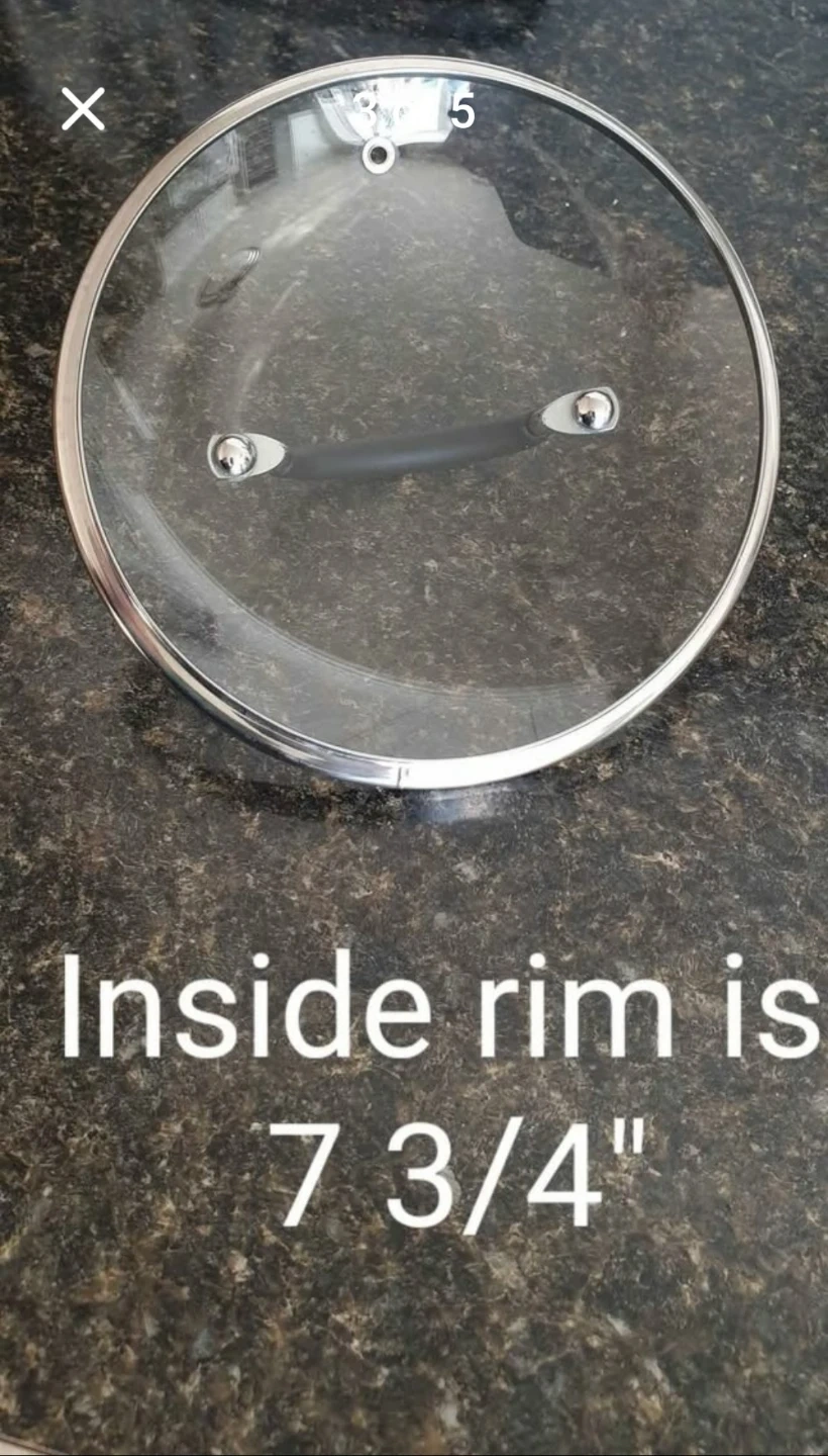Clear glass lid with stainless steel rim and black plastic handle. Inside rim measures 7 3/4 inches. Cash only please.
