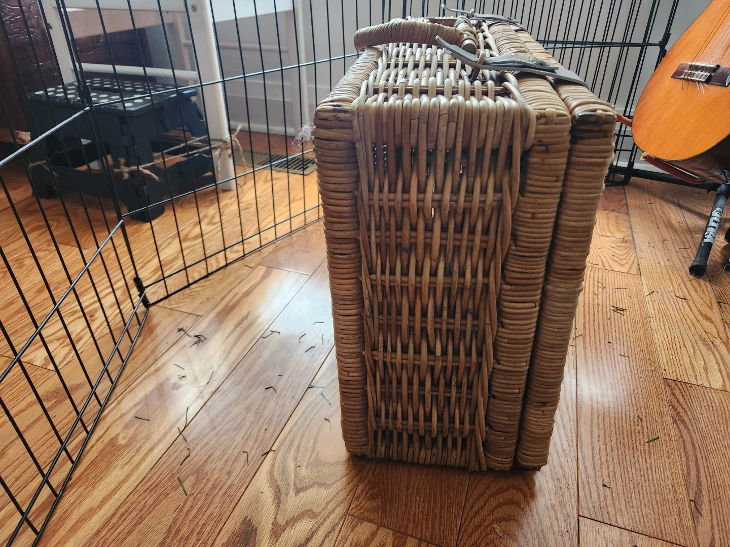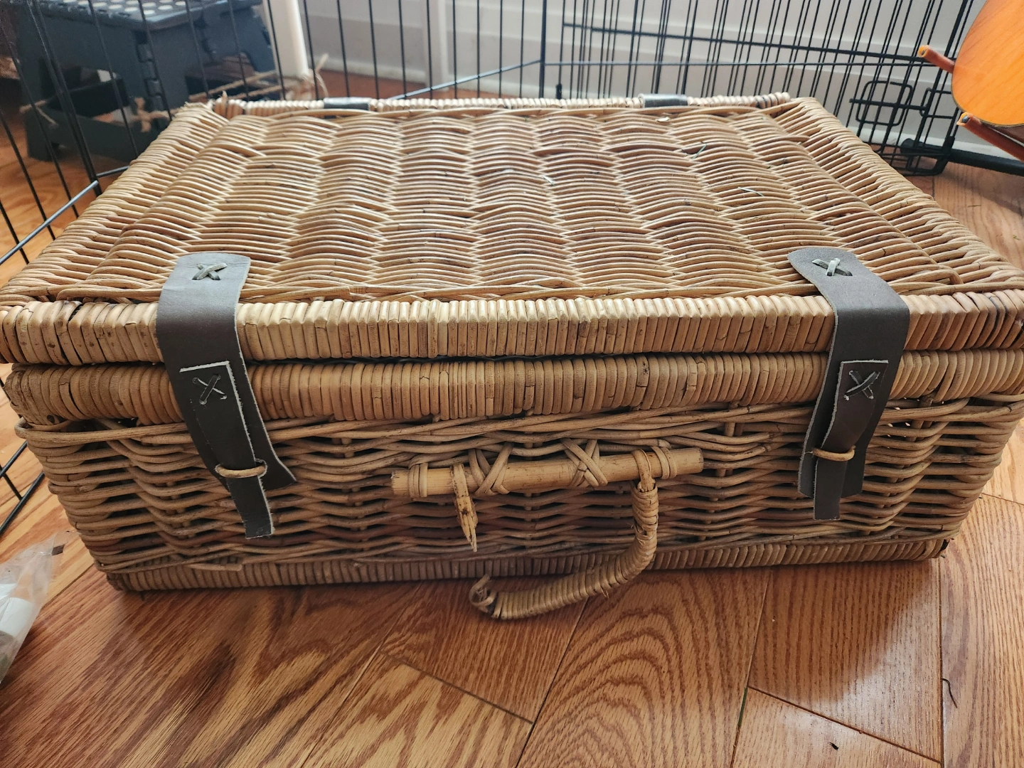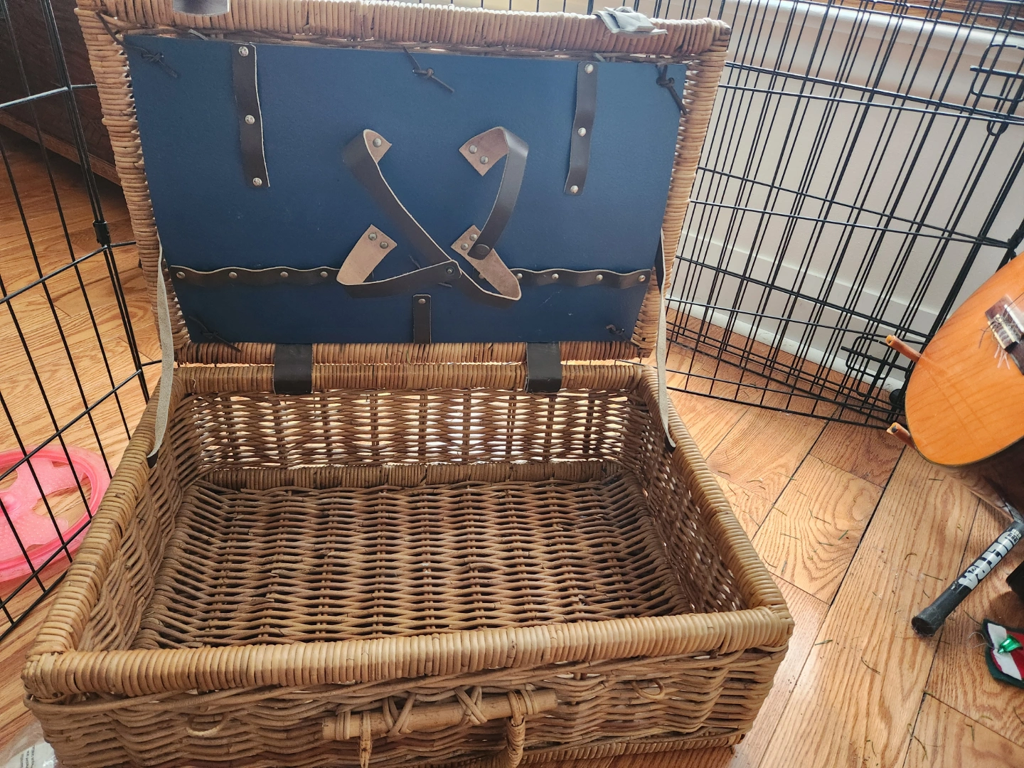 Wicker picnic basket. Brown wicker exterior. Blue interior lining. Leather straps and handle. Great for storage or picnics.Only handle is broken but can be replaced.