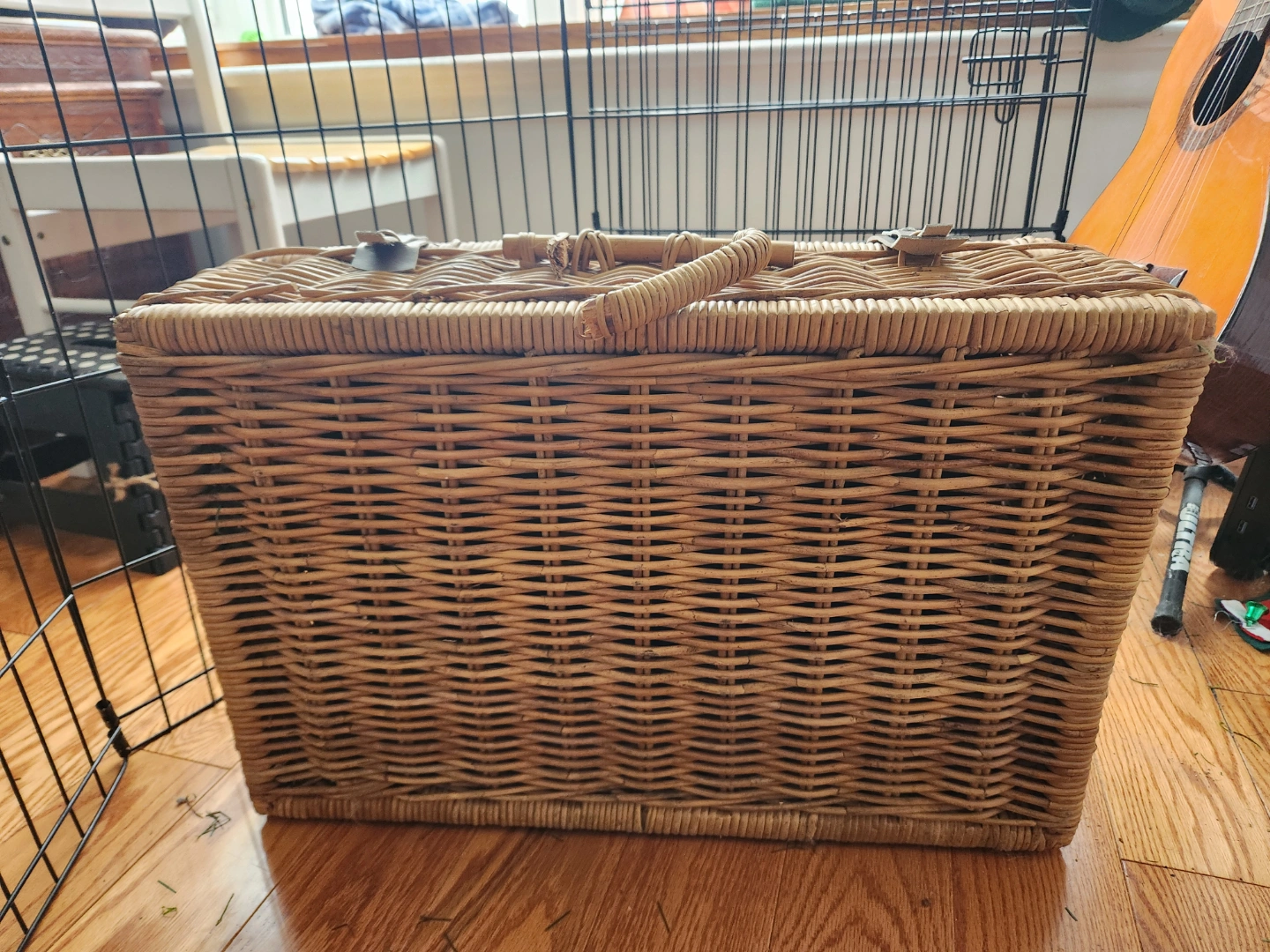 Wicker picnic basket. Brown wicker exterior. Blue interior lining. Leather straps and handle. Great for storage or picnics.Only handle is broken but can be replaced.