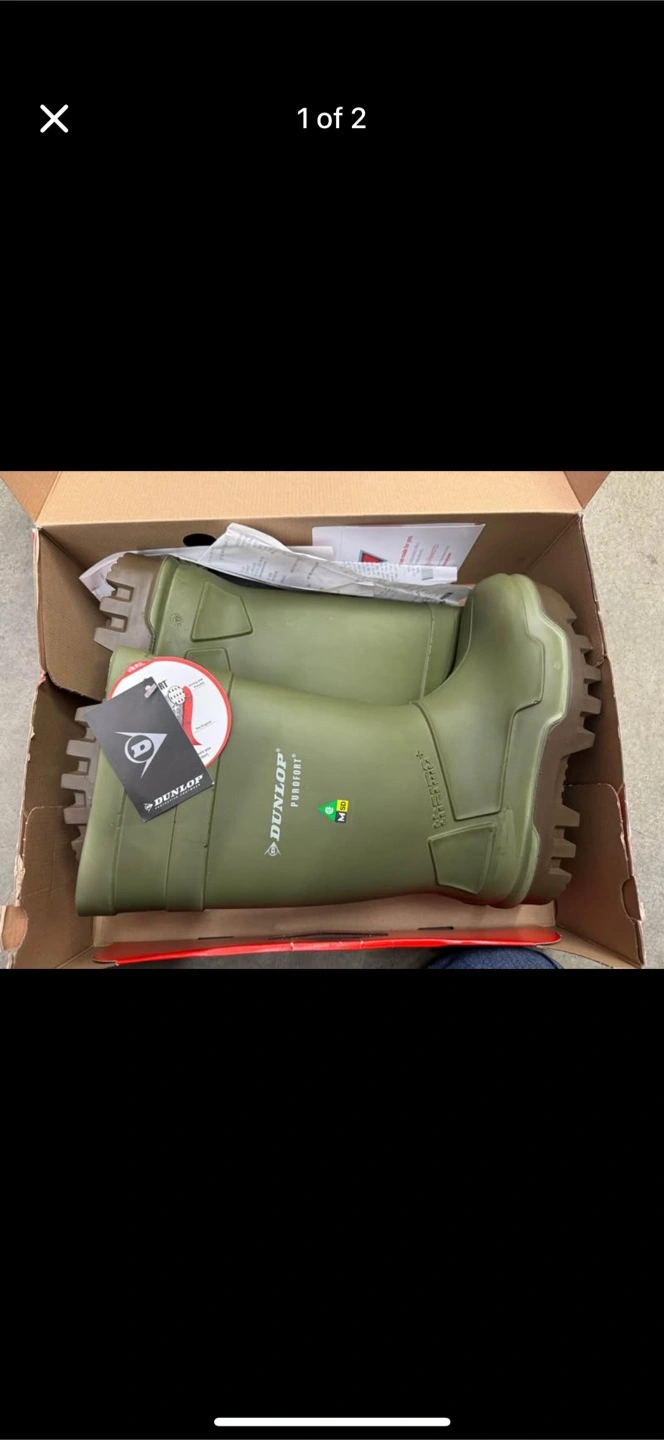 New in box Dunlop Purofort Thermo+ safety boots. Size 7, green/brown. Full safety features. Excellent condition.