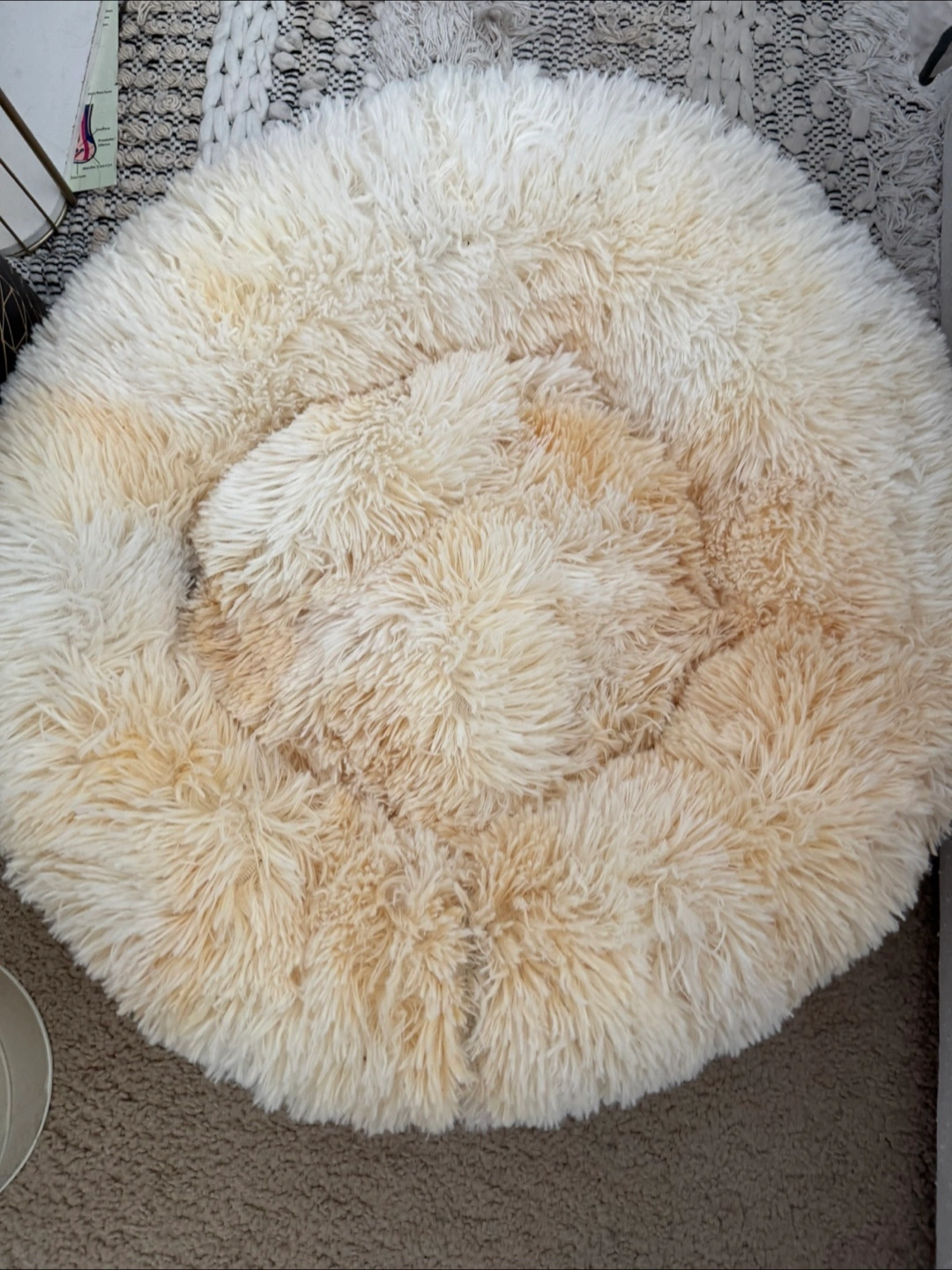 Round pet bed. Soft, fluffy material. Cream colour. Suitable for small to medium-sized pets. Shows some minor discoloration.