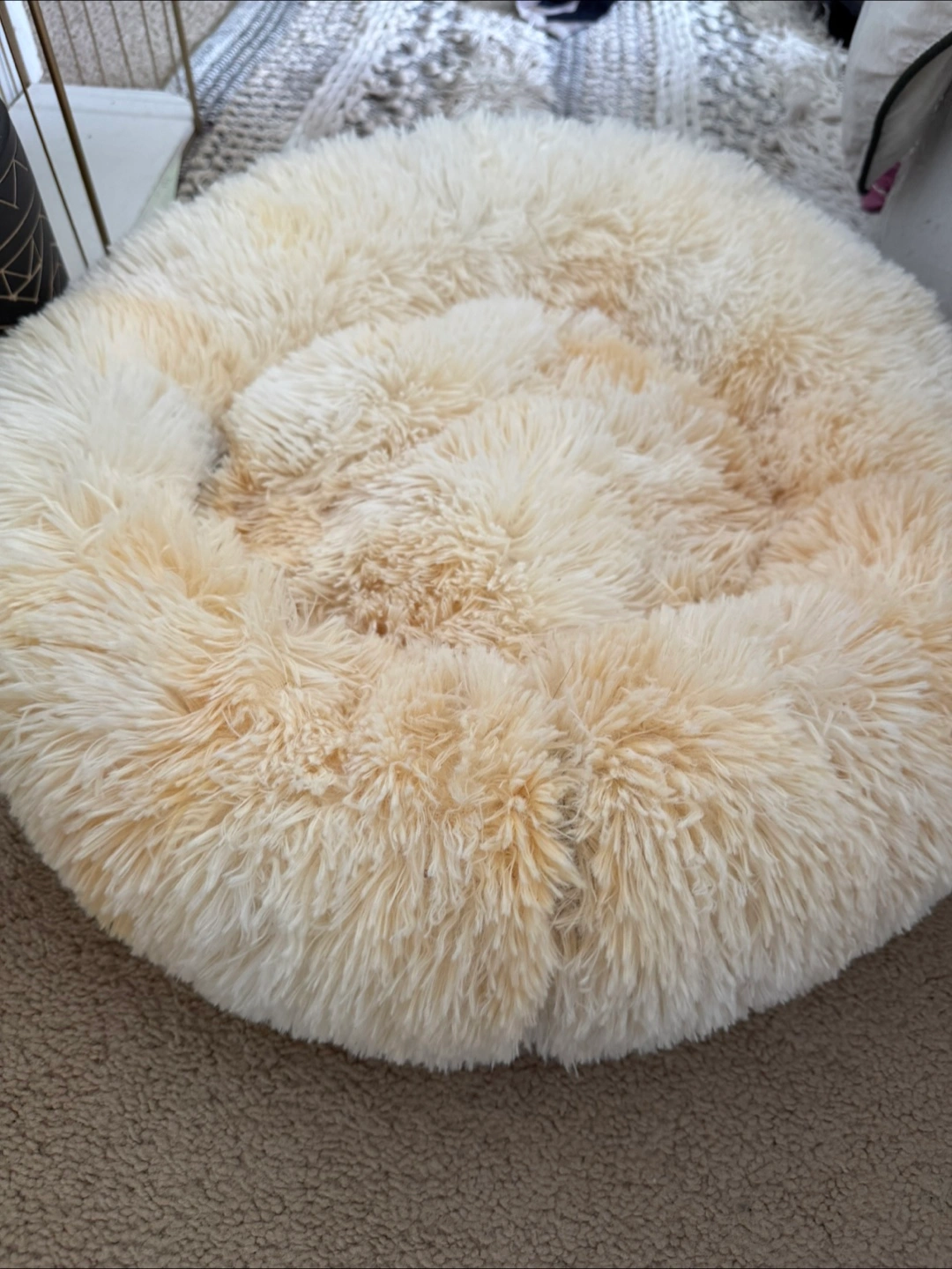Round pet bed. Soft, fluffy material. Cream colour. Suitable for small to medium-sized pets. Shows some minor discoloration.