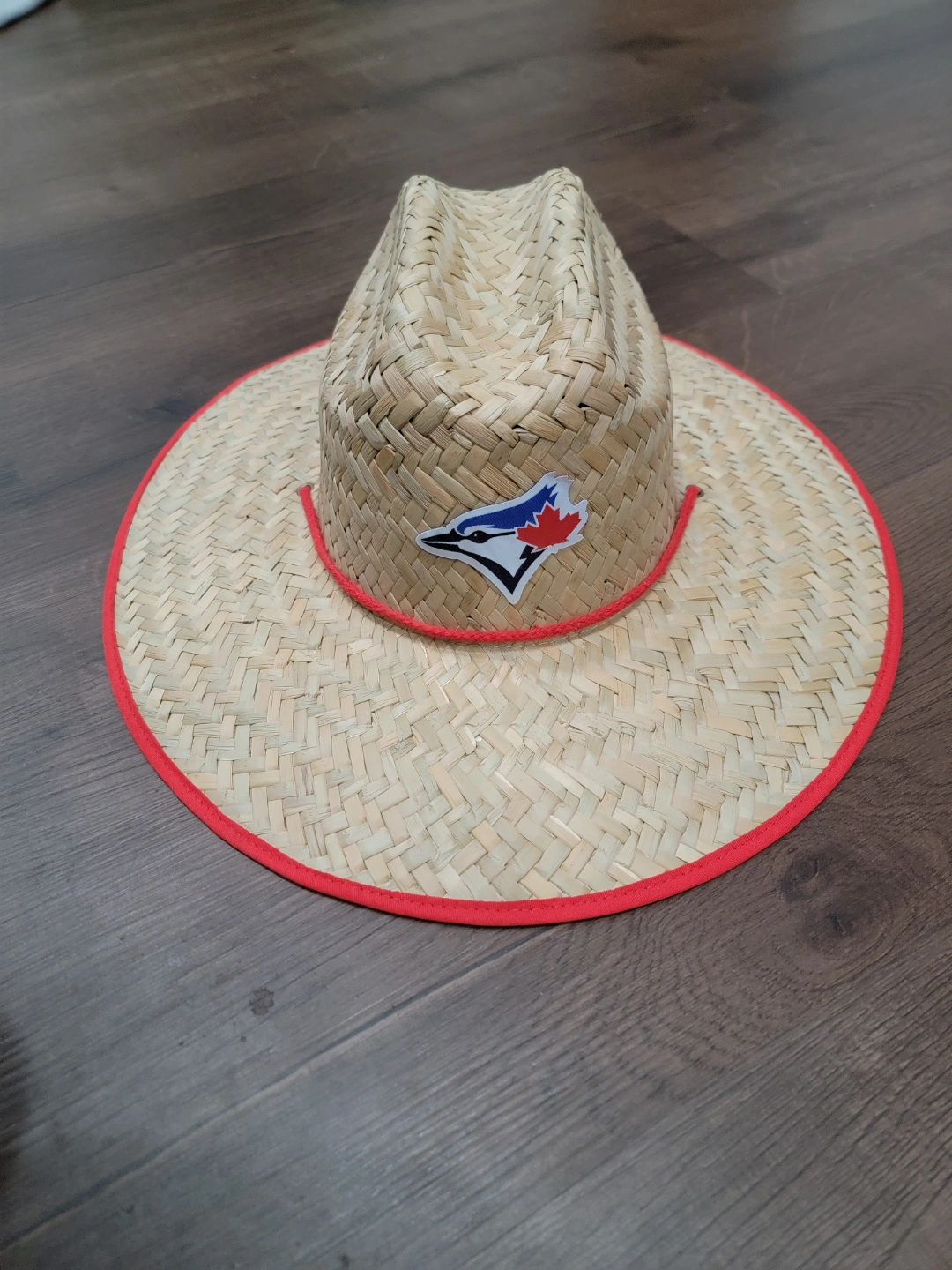 Lightweight straw hat. Features a Toronto Blue Jays logo. Red trim. Red and white maple leaf design inside. Adjustable chin strap.