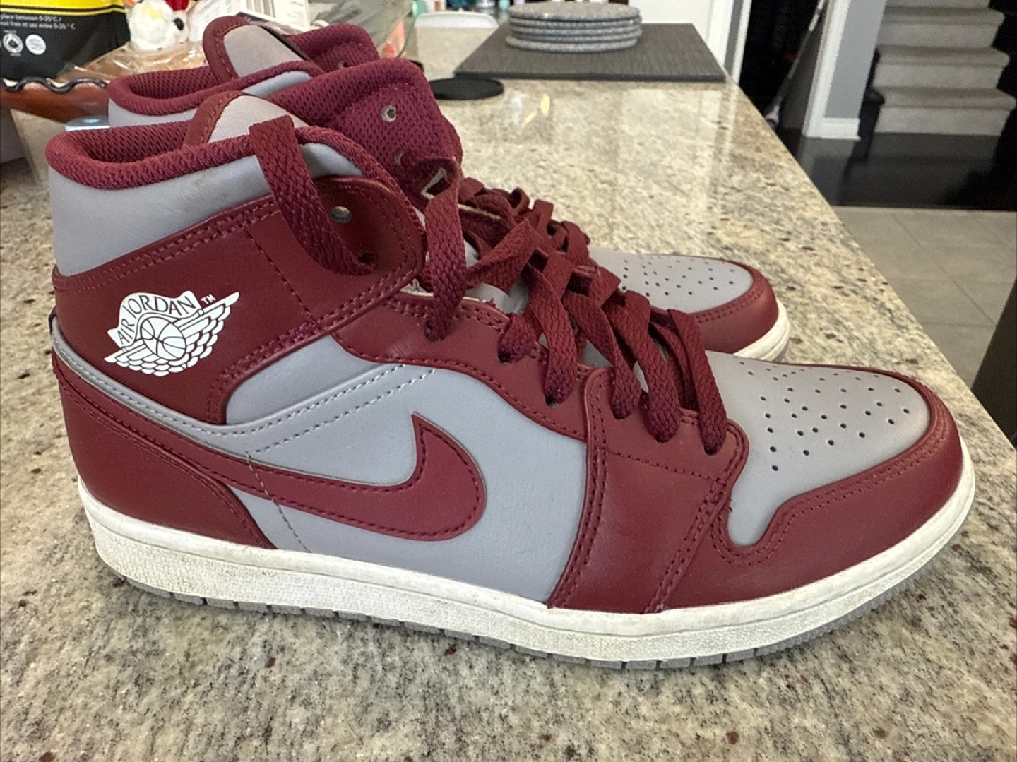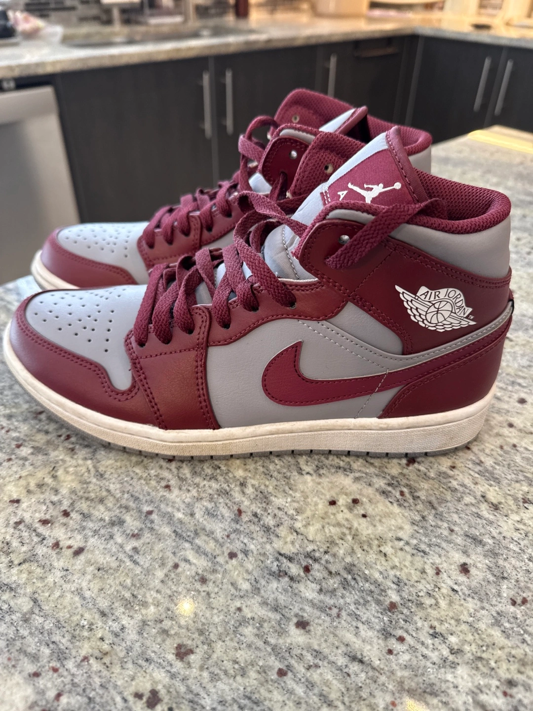 Pre-owned Air Jordan 1 Mid sneakers. Burgundy and grey colour scheme. High-top design. Lace-up closure. Good condition. Size 8 US