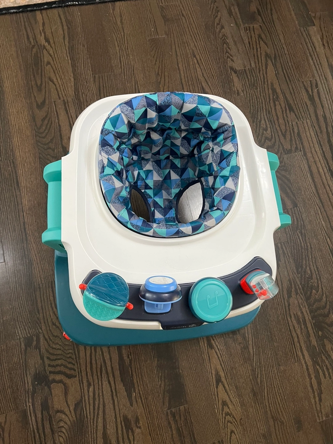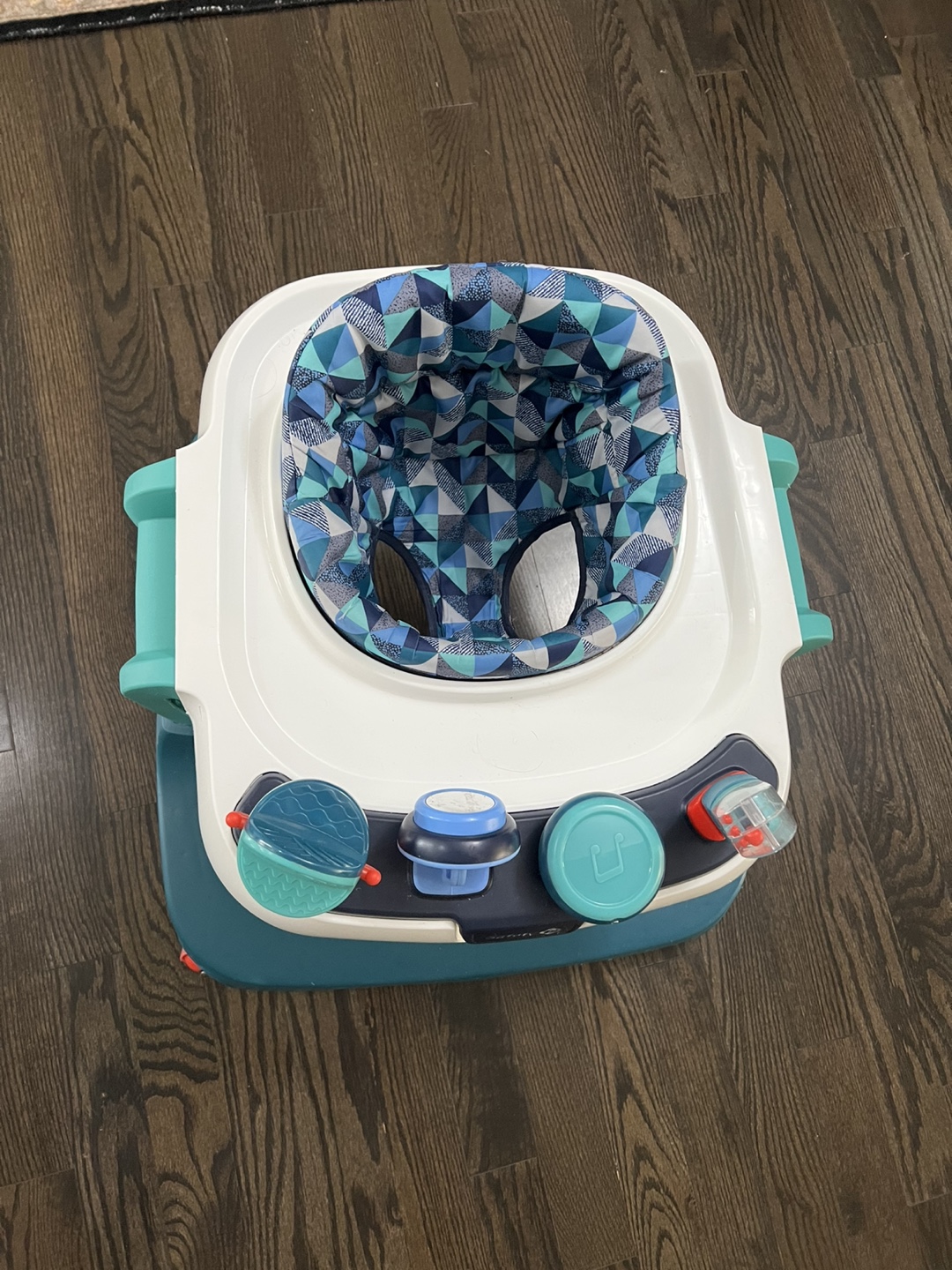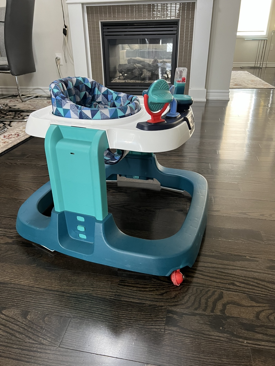 Baby walker, teal and white colour scheme. Geometric patterned seat. Multiple activity toys. Good used condition.