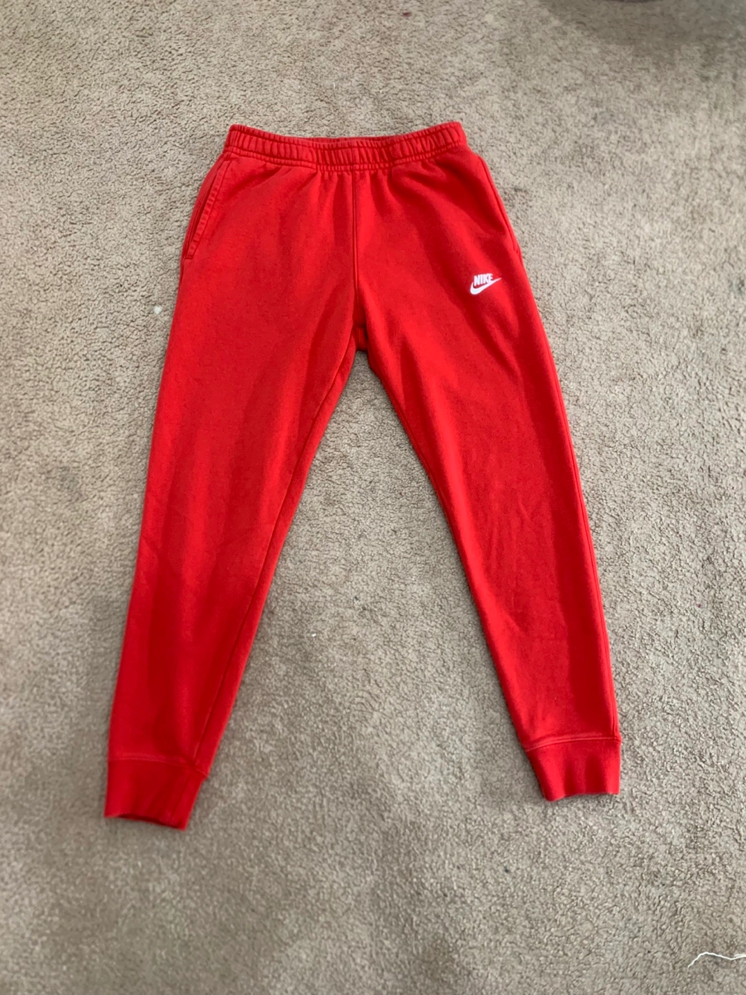 Red Nike sweatpants. Size small. Made in Cambodia. Elastic waistband and cuffs. Small embroidered logo. (Real)