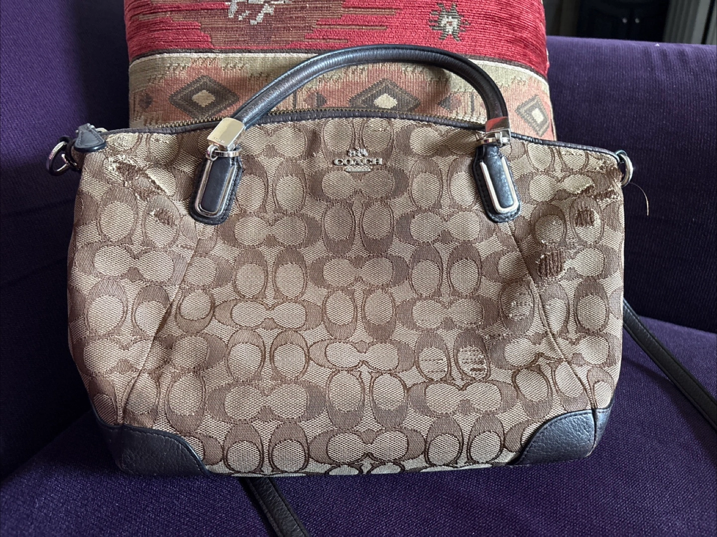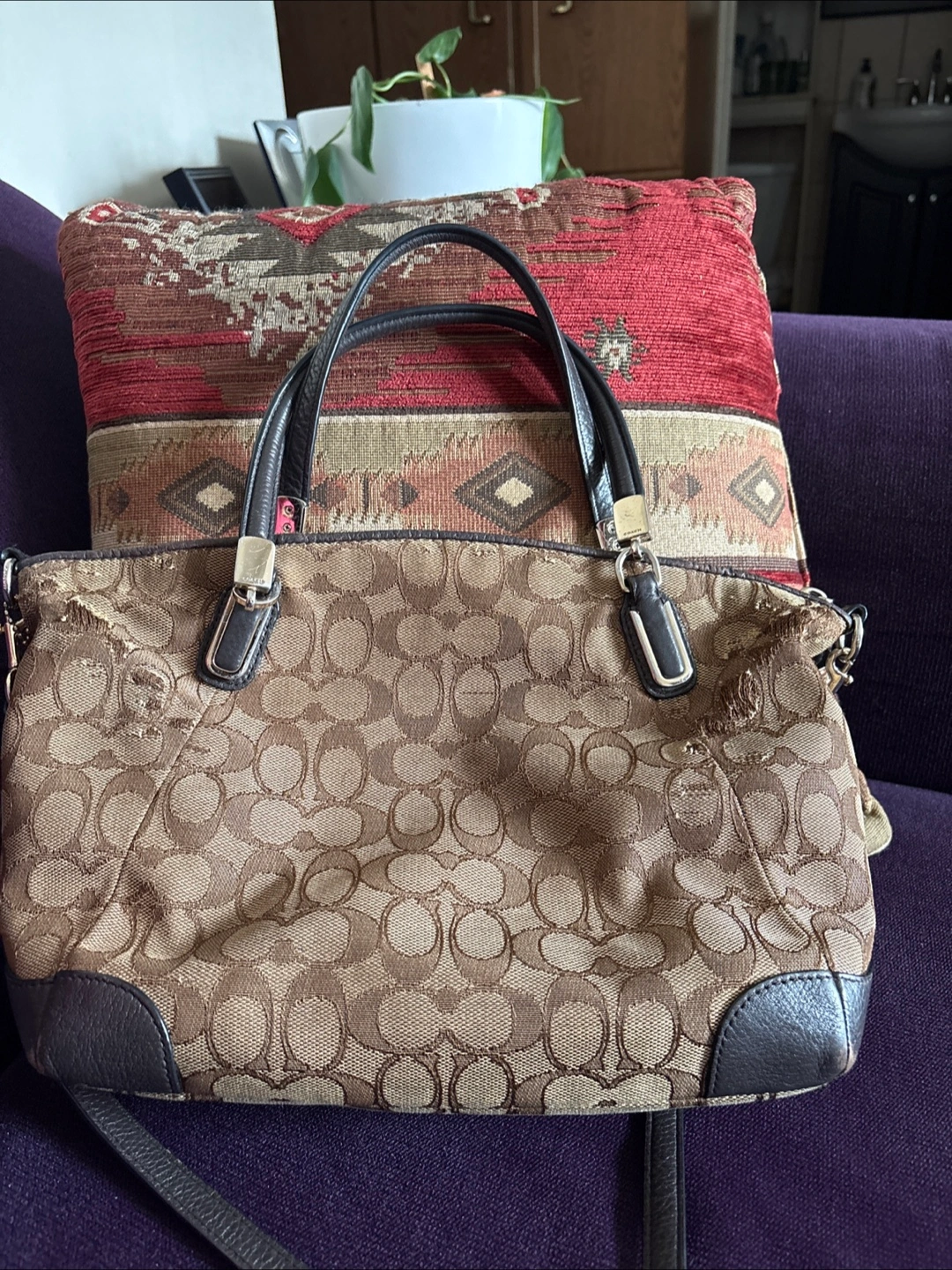 Pre-owned Coach handbag. Brown signature canvas. Leather trim. Minor wear. Top handles and shoulder strap. Great everyday bag.