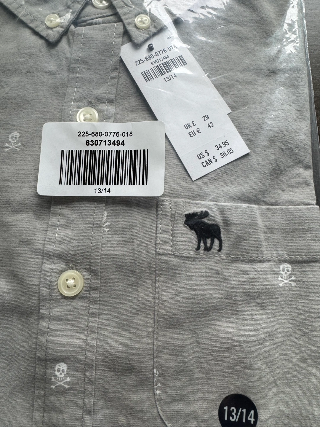 Abercrombie Kids boys' button-down shirt. Long sleeves. Size 13/14. Grey colour with subtle skull print. Embroidered moose logo on pocket. New with tags. Original price: $36.95
