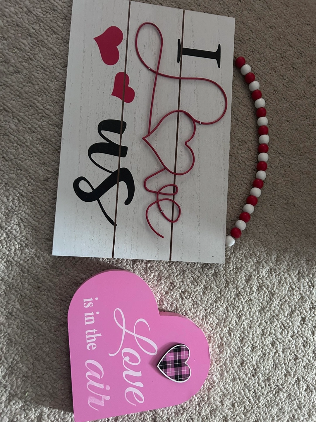 Two Valentine's Day decorations. A wooden sign with wire hearts and the words 'I love us'. A pink heart-shaped plaque with 'Love is in the air'. Both almost brand new! Just trying to declutter :)