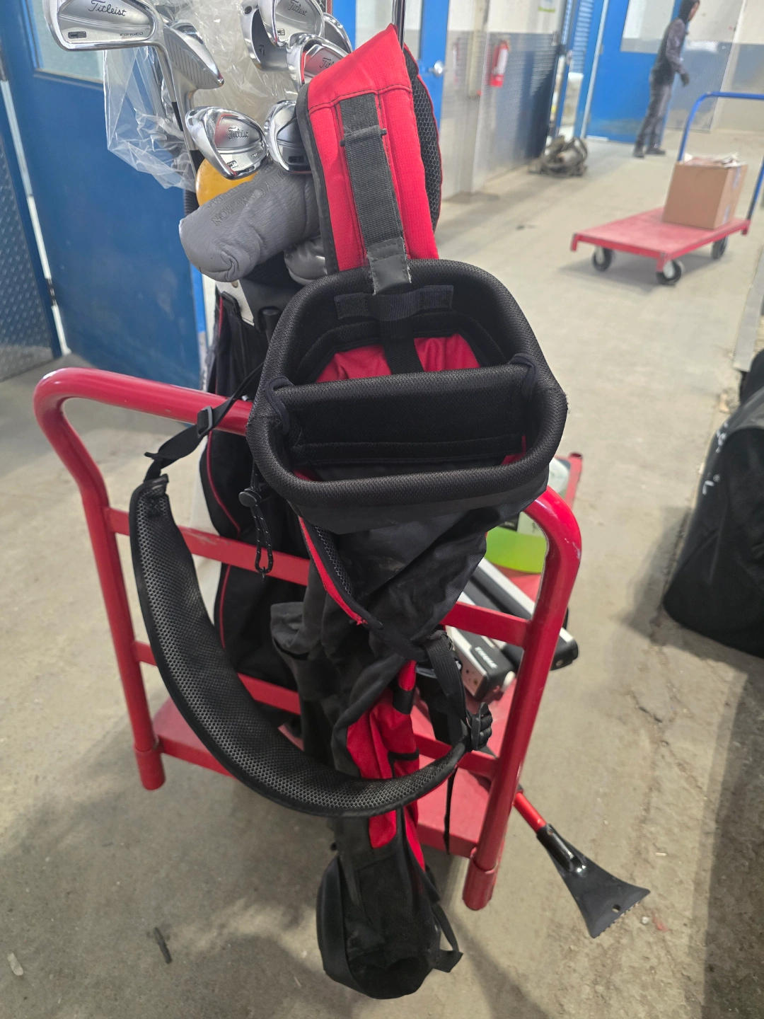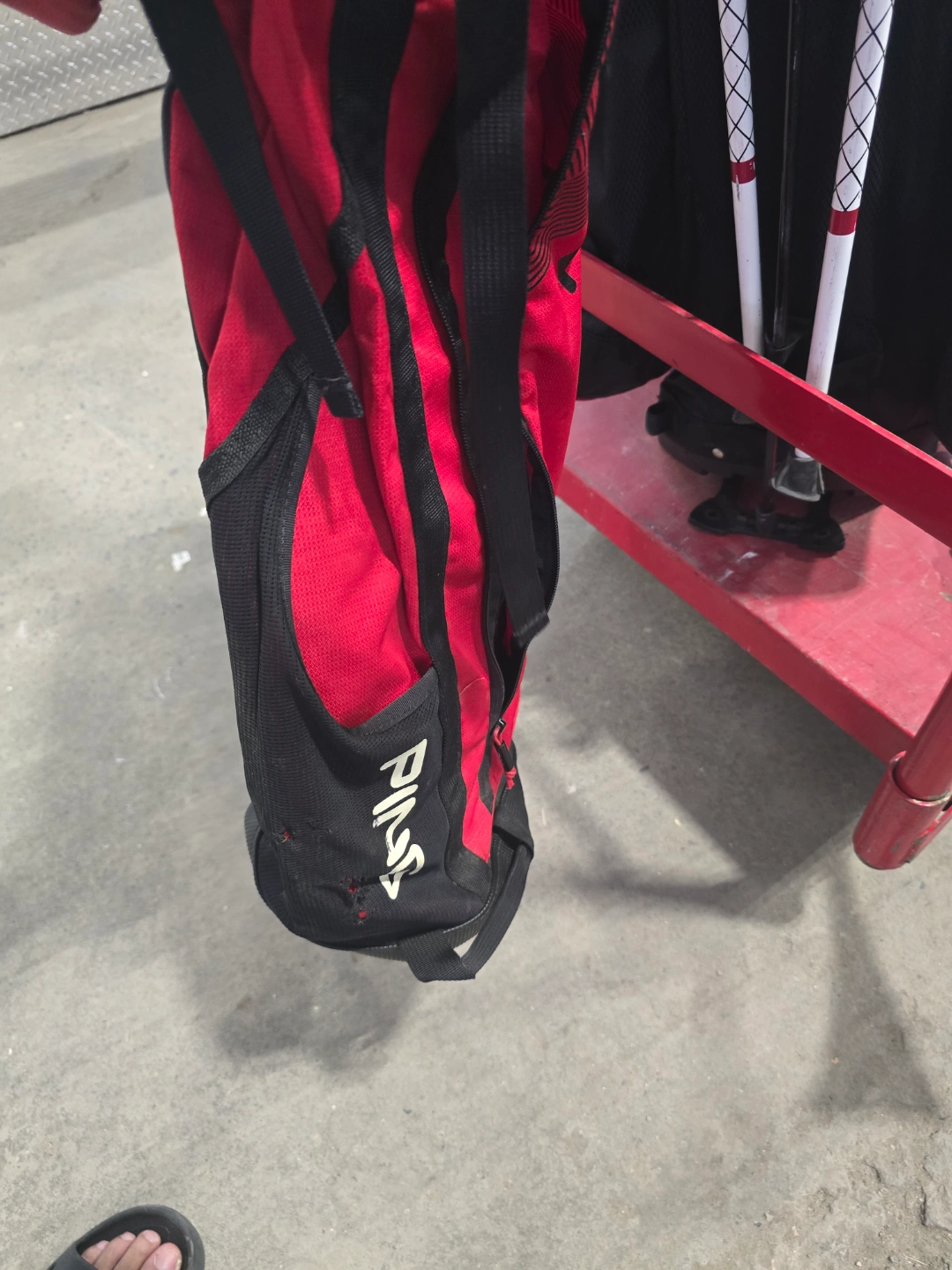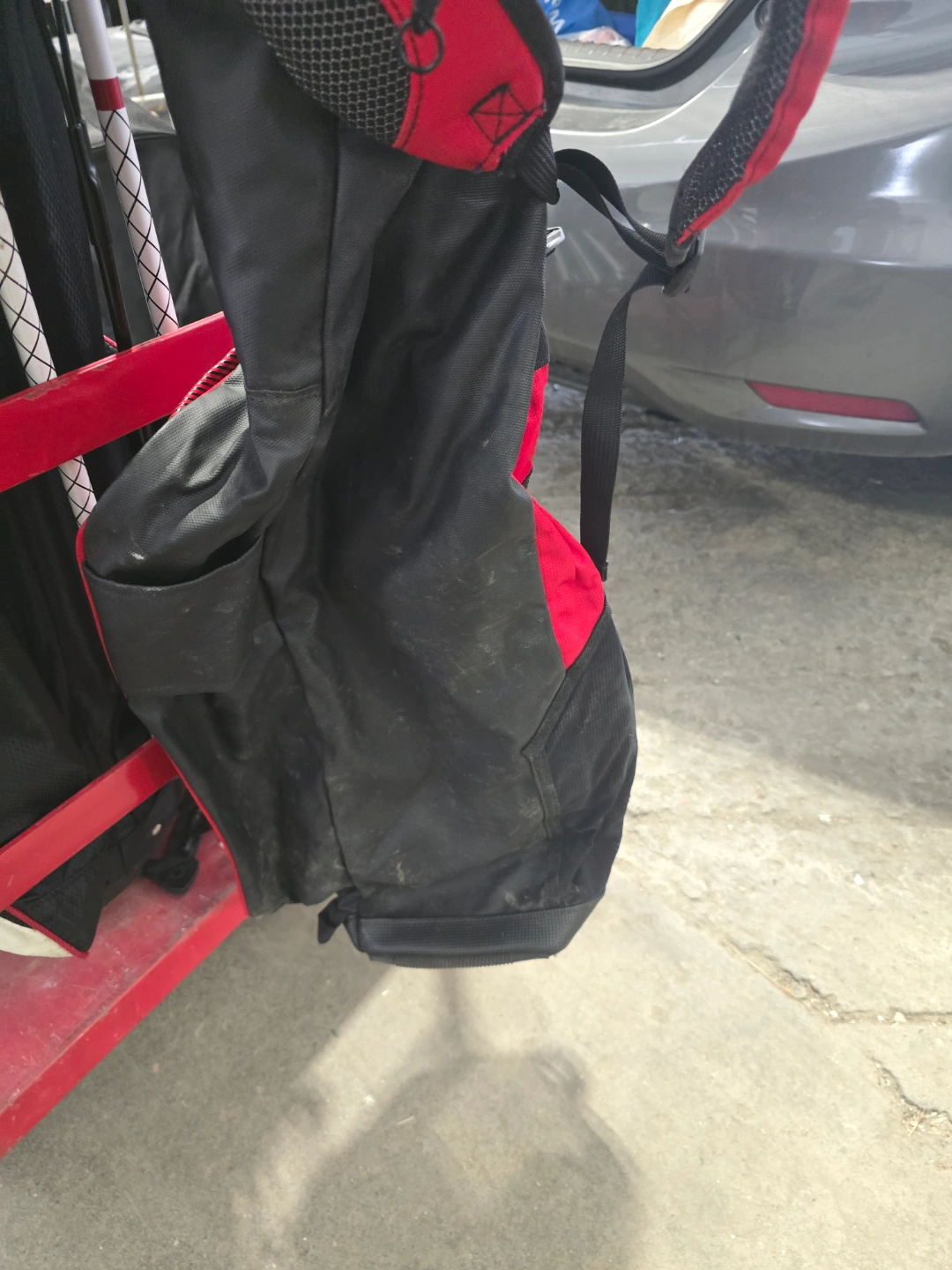 PING golf sunday bag. Red and black colour scheme. Shows some wear.