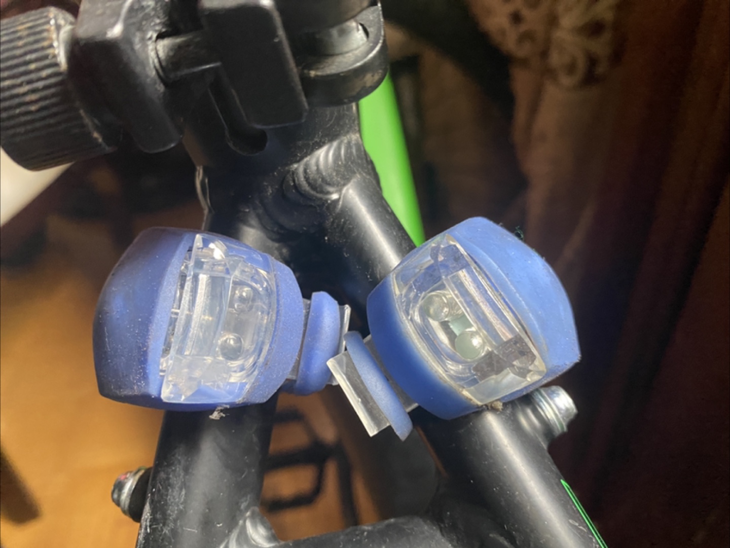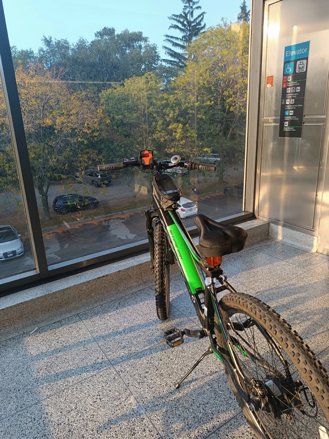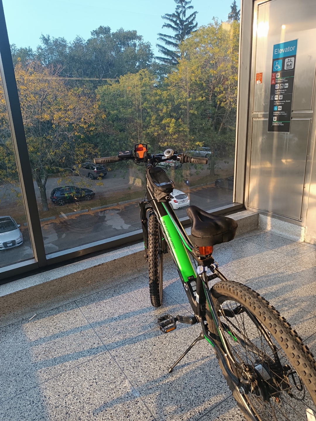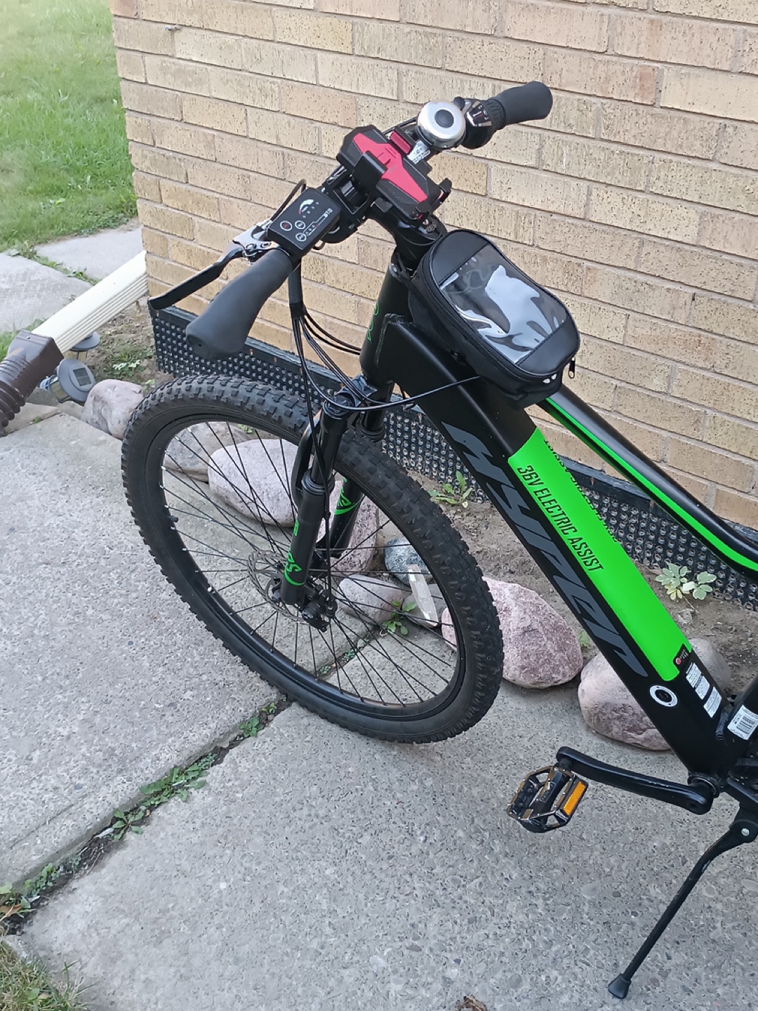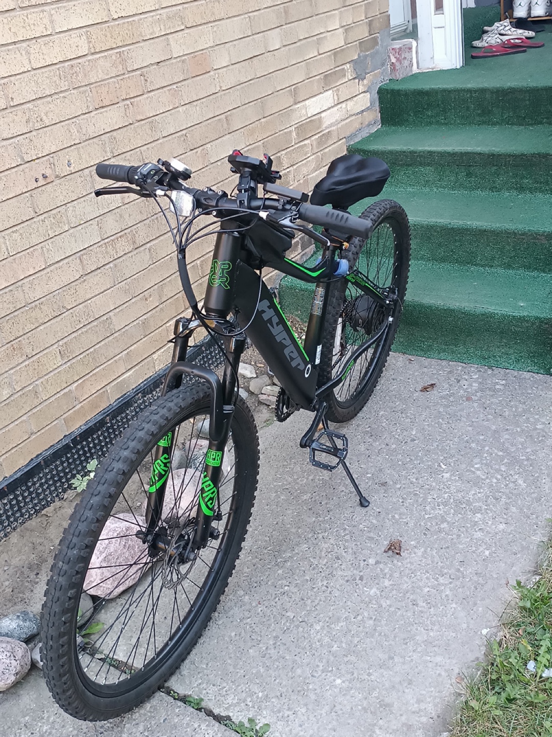 Great condition electric mountain bike. 26" wheels. Black frame with green accents. Includes front suspension, kickstand, and small handlebar bag.