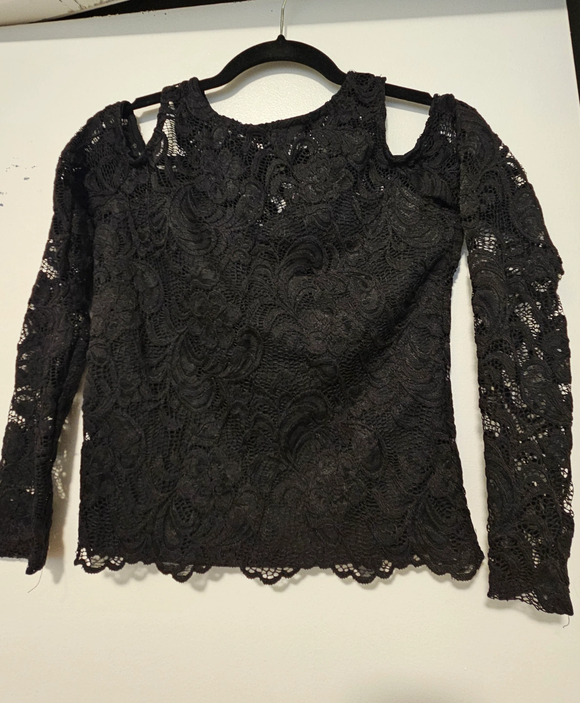 Long sleeve black lace top. Cold shoulder detail. Scalloped hem. Fits like a small. Pickup downtown Toronto