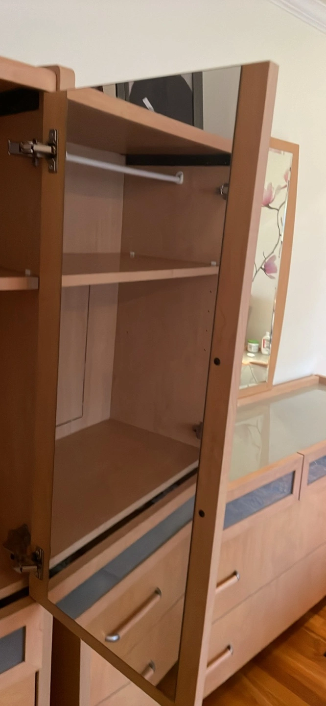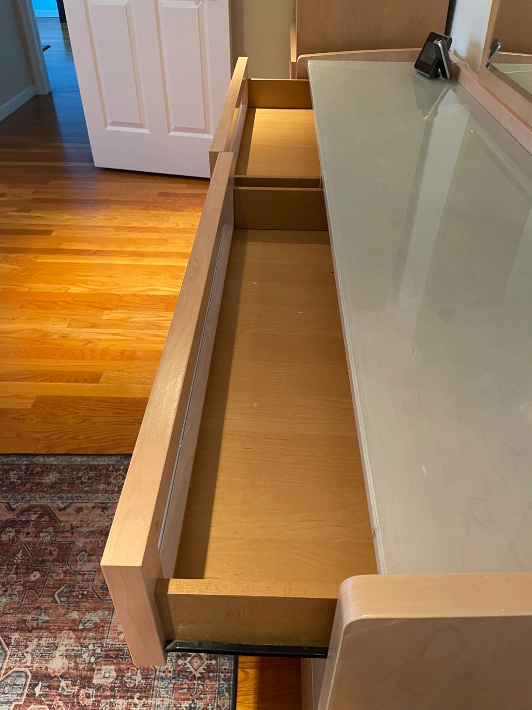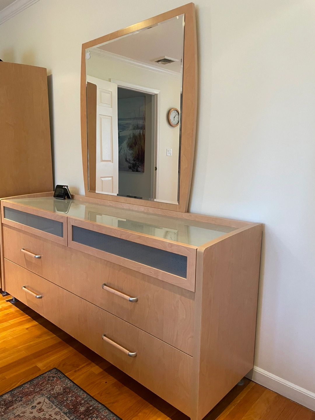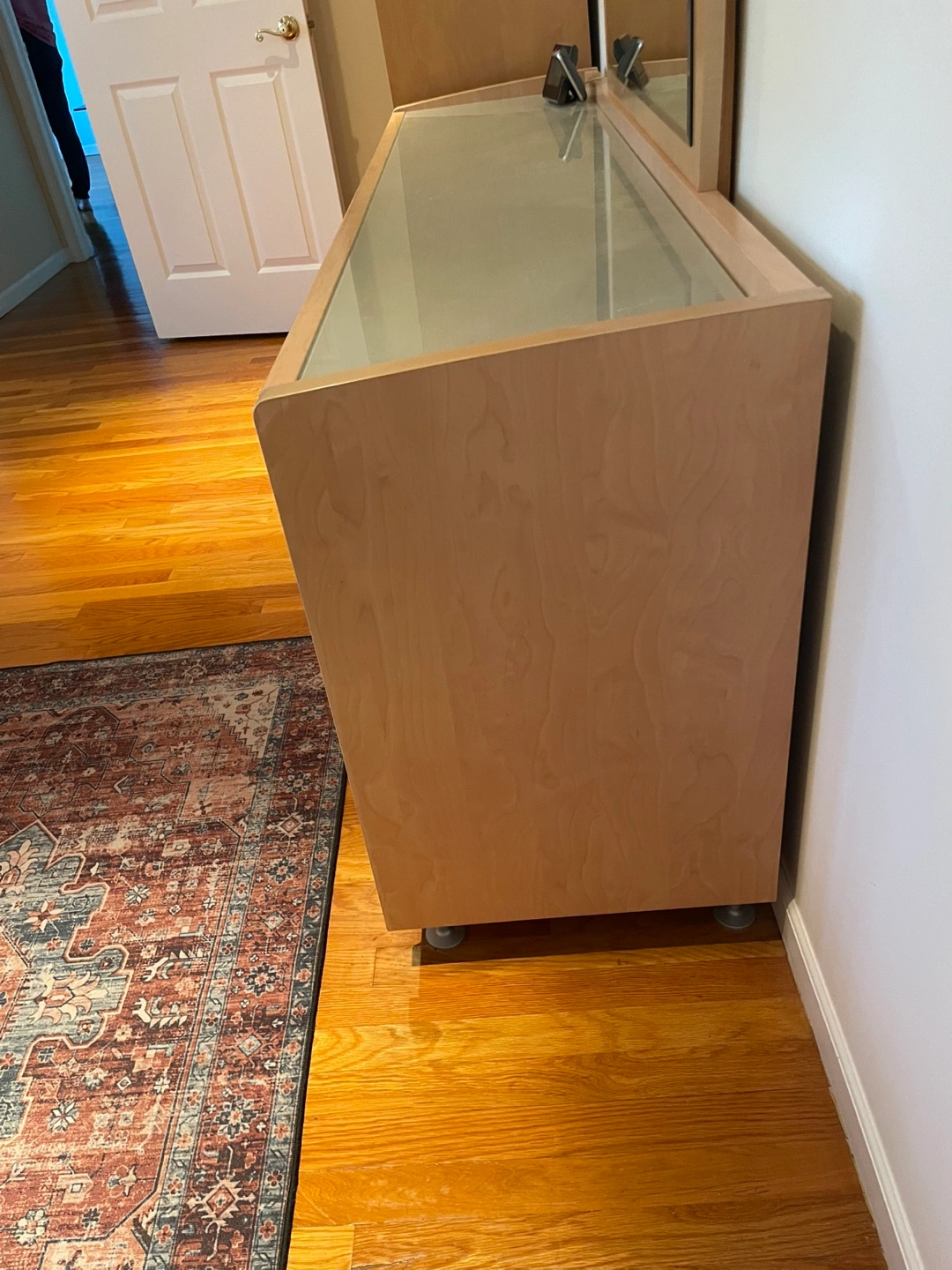 Beautiful light wood vanity set. Features three drawers, a large mirror, and a glass top. Modern design, great for bedroom or bathroom.