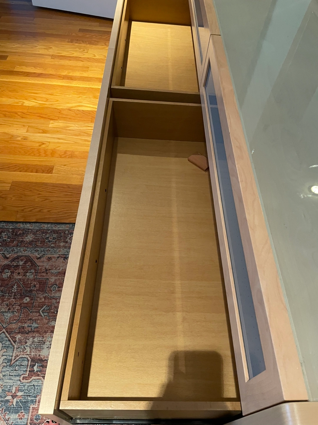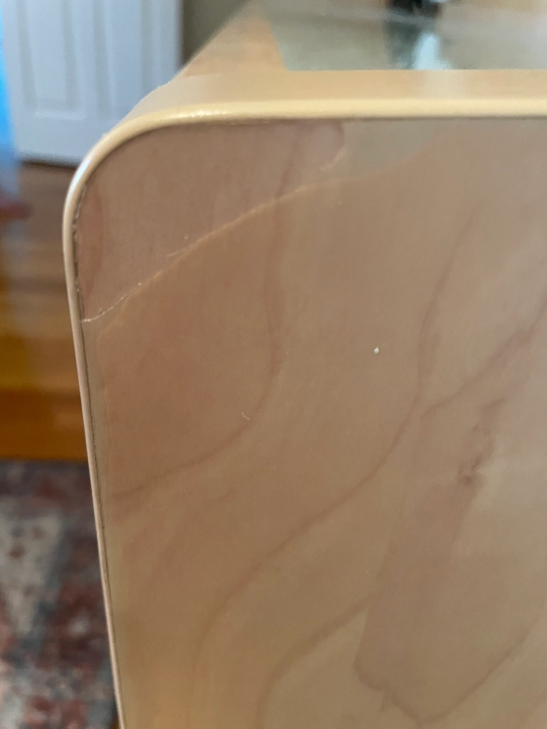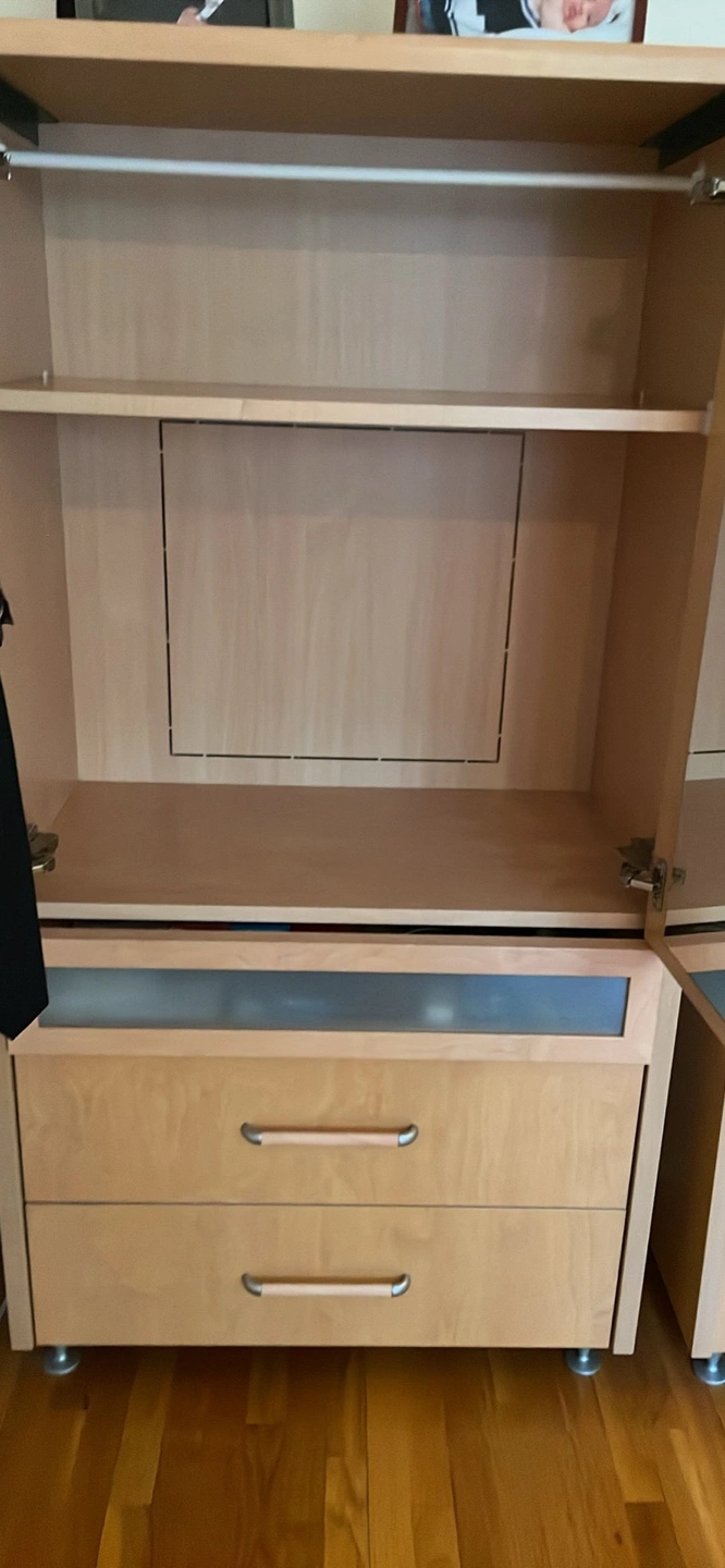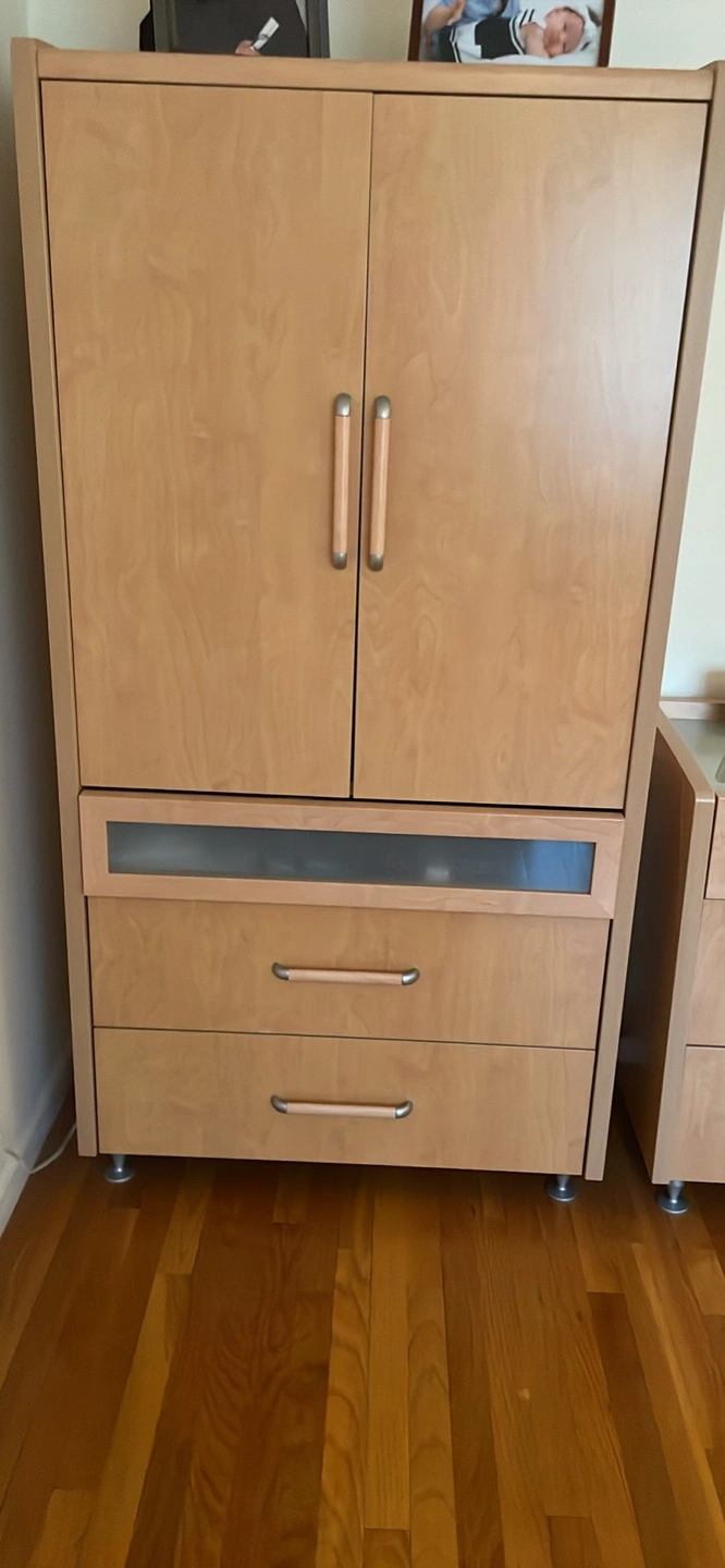 Beautiful light wood vanity set. Features three drawers, a large mirror, and a glass top. Modern design, great for bedroom or bathroom.