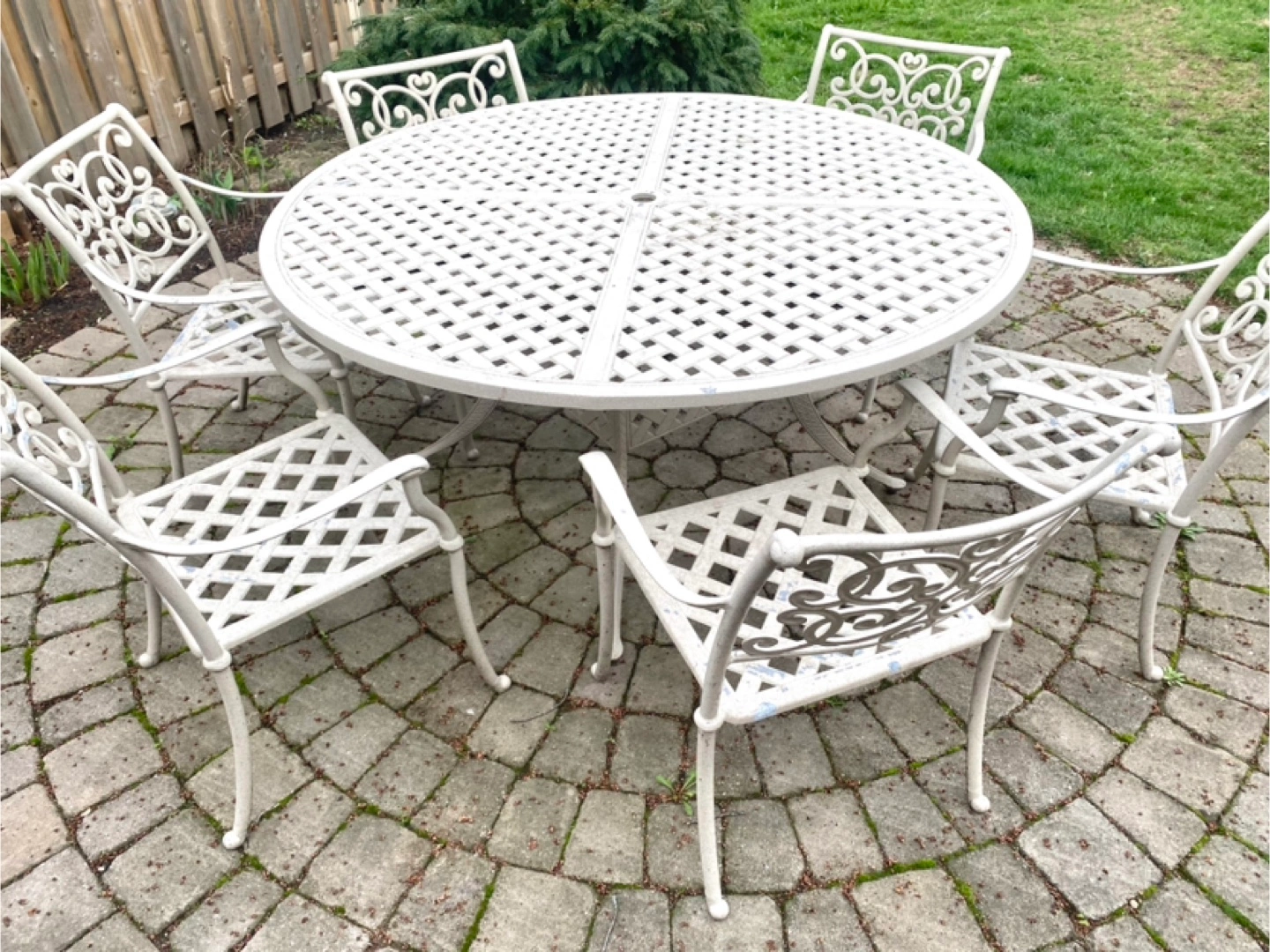Solid 7 piece outdoor furniture in great condition. The table is just over 5ft. Sold together. Cushions included.