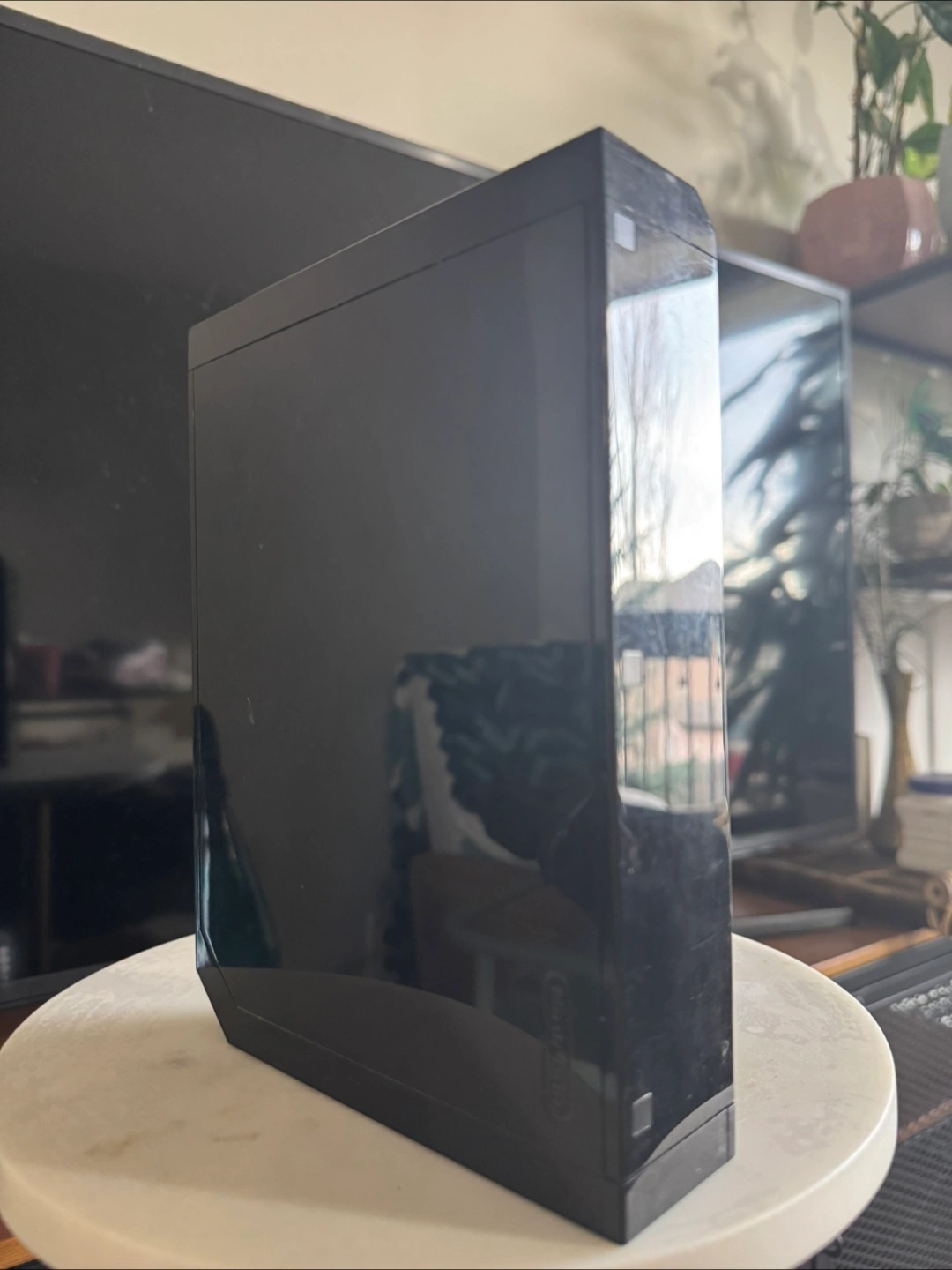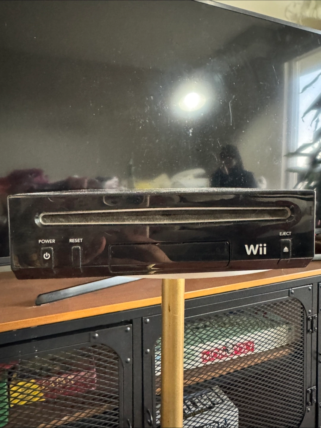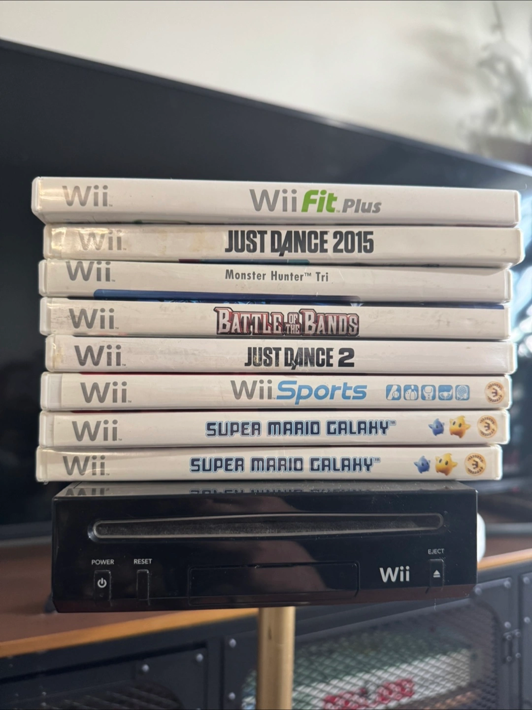 Black Nintendo Wii console. Includes several games and a white Wii Balance Board. Some wear and tear expected from previous use. Great for family fun!