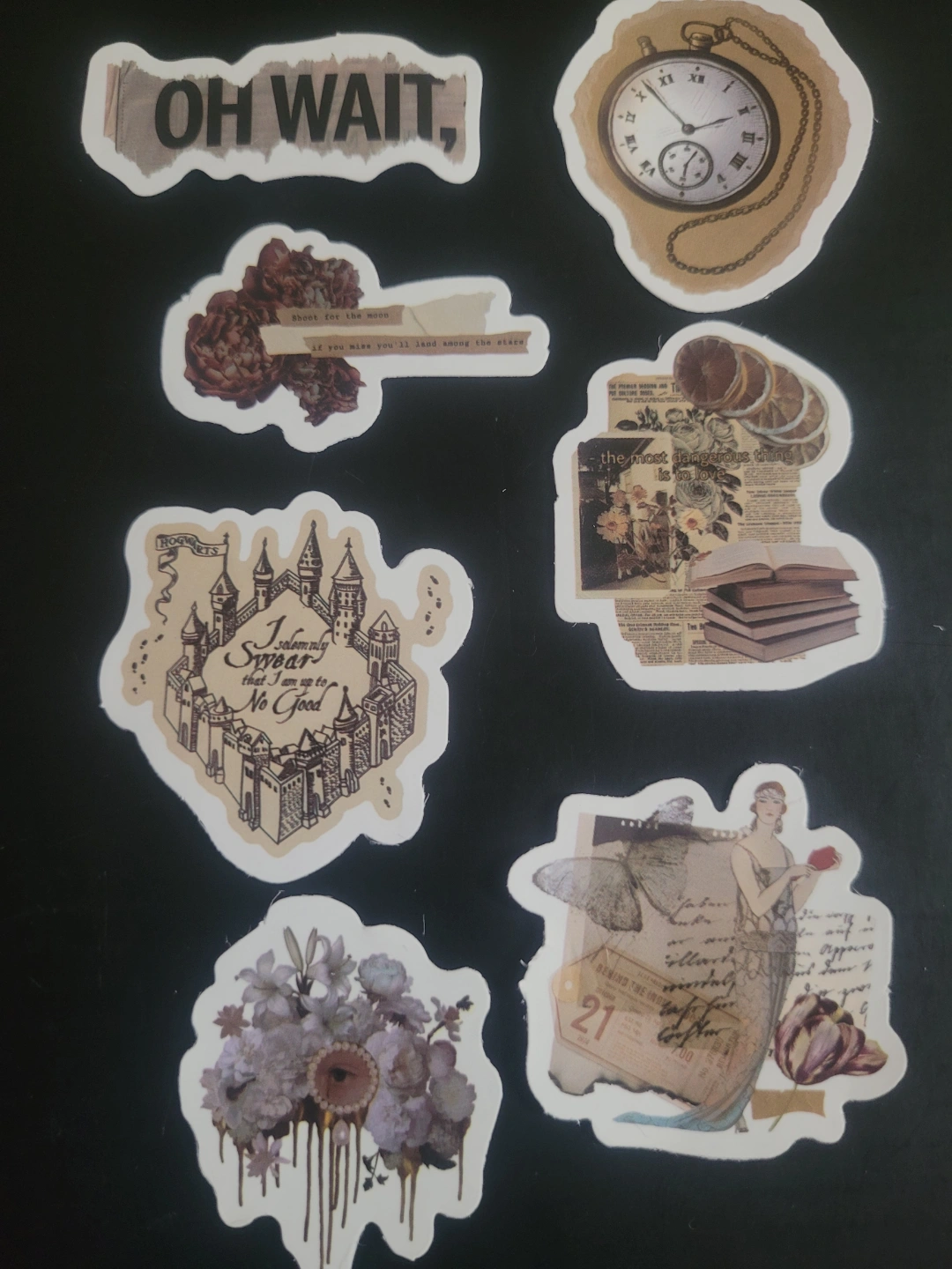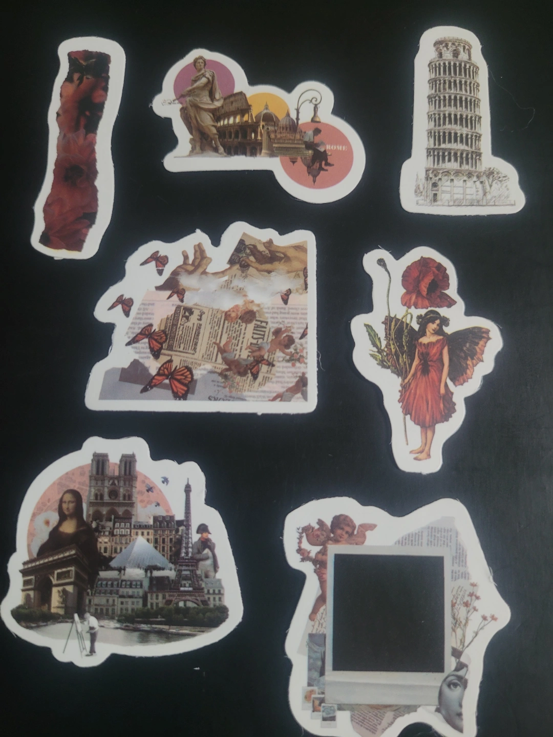 Set of 30 unique stickers. Various designs: roses, vintage photos, books, architecture, and more. Perfect for journals, laptops, or planners. Aesthetic and collage style. Amazing scrapbook style stickers!