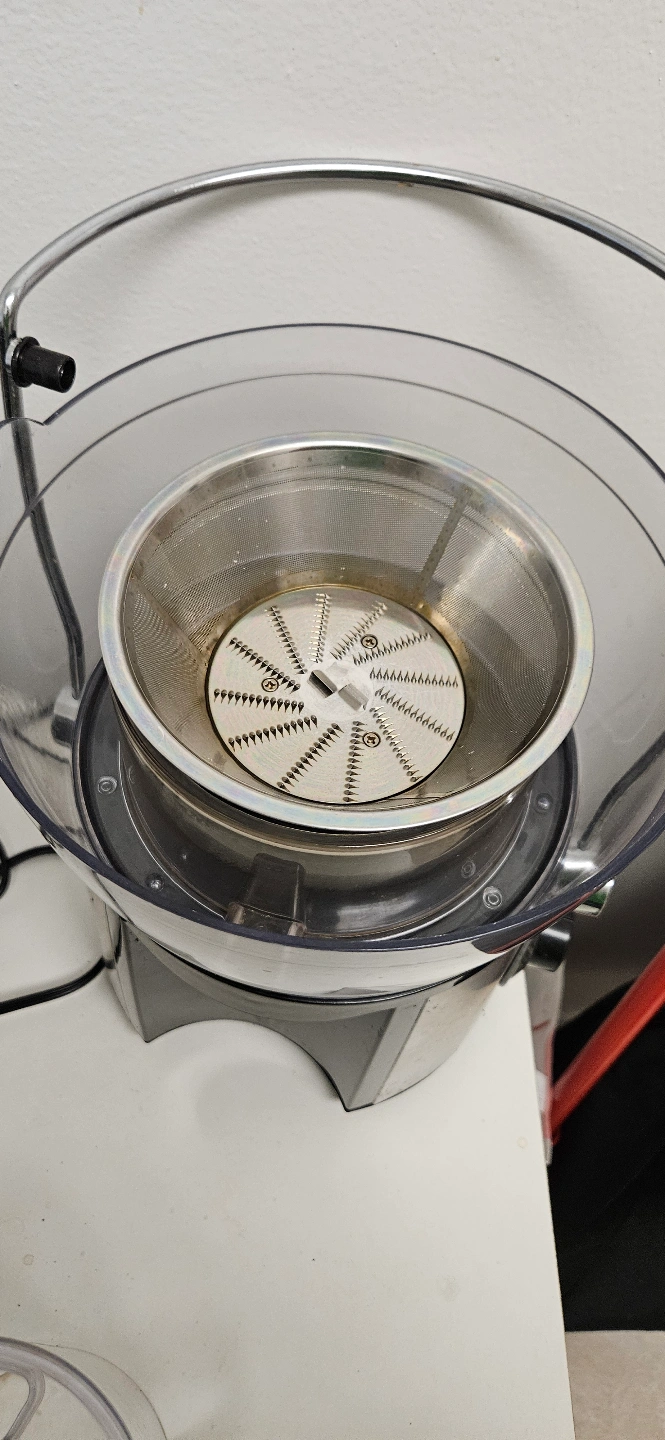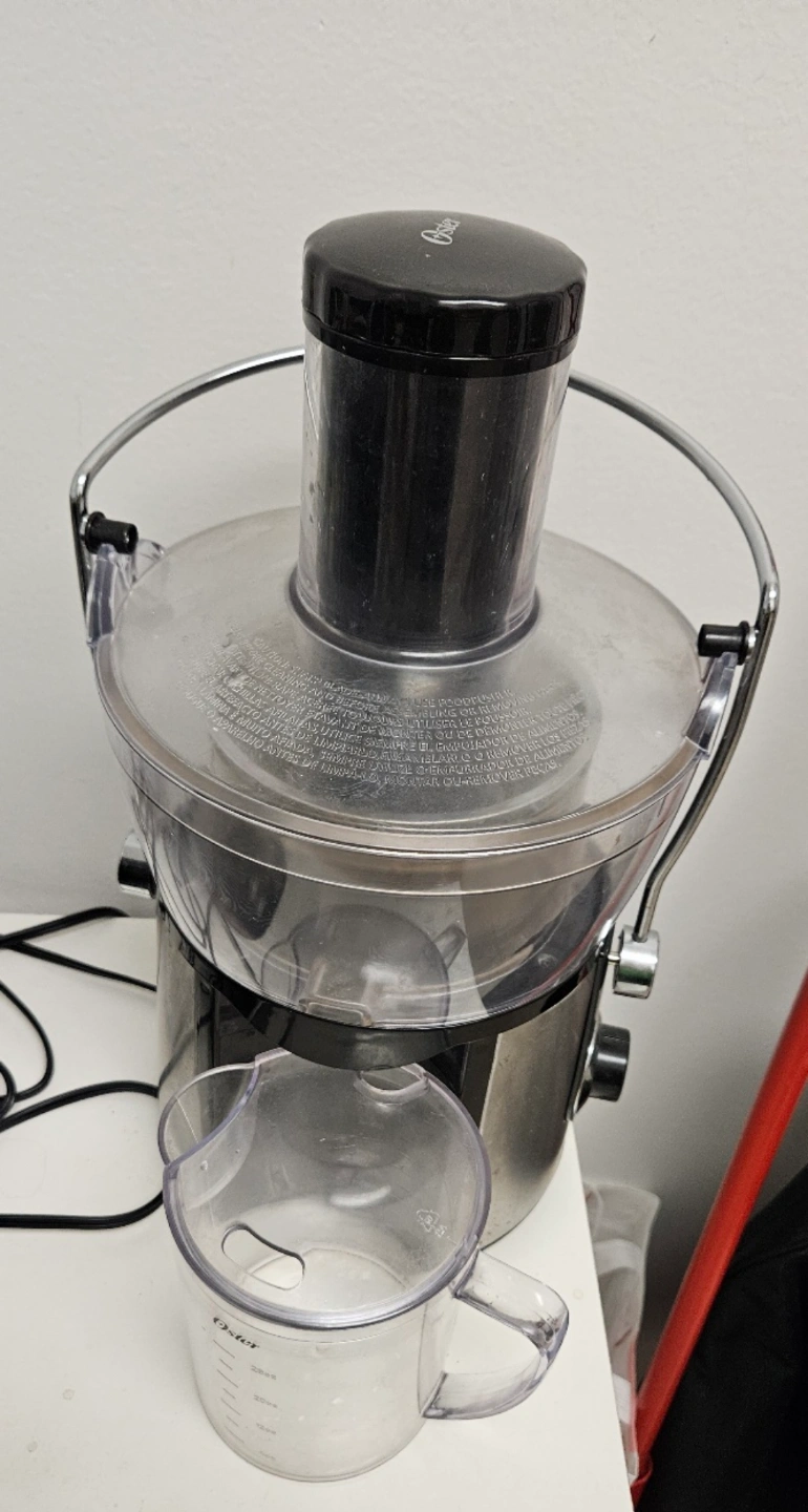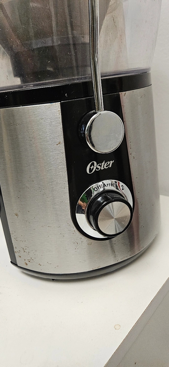 Pre-owned Oster juice extractor. Stainless steel design. Includes pulp container and juice jug.