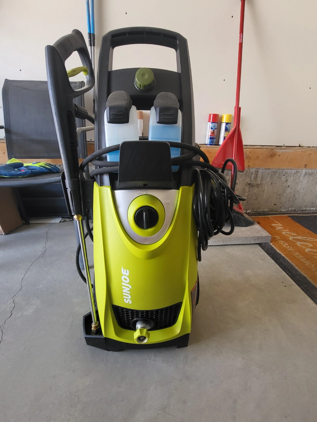 Electric pressure washer. Includes wand, hose and multiple nozzles for various PSI pressure. Two detergent tanks. Extra long hose. Great for cleaning patios, decks and vehicles.