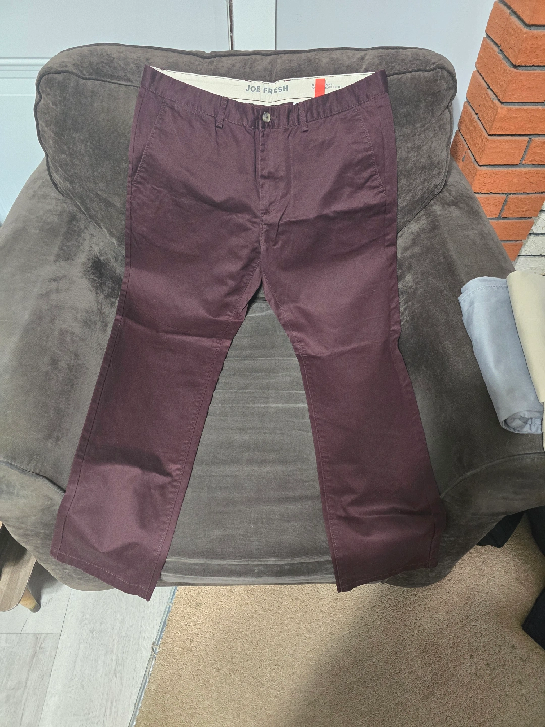 Bundle of men's pants. Includes black CK, grey JOE Fressh slim, Khaki LK, burgundy Joe Fresh, excellent condition.
