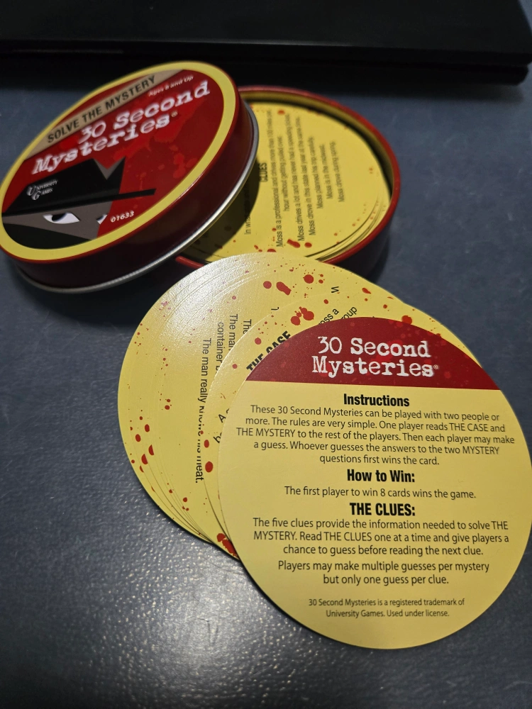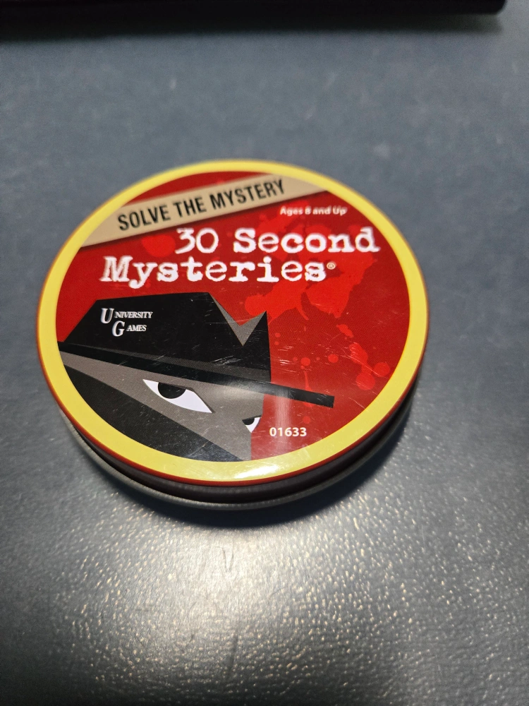Fun card game. Solve mysteries in 30 seconds. Includes 64 cards and instructions. Ages 8 and up.