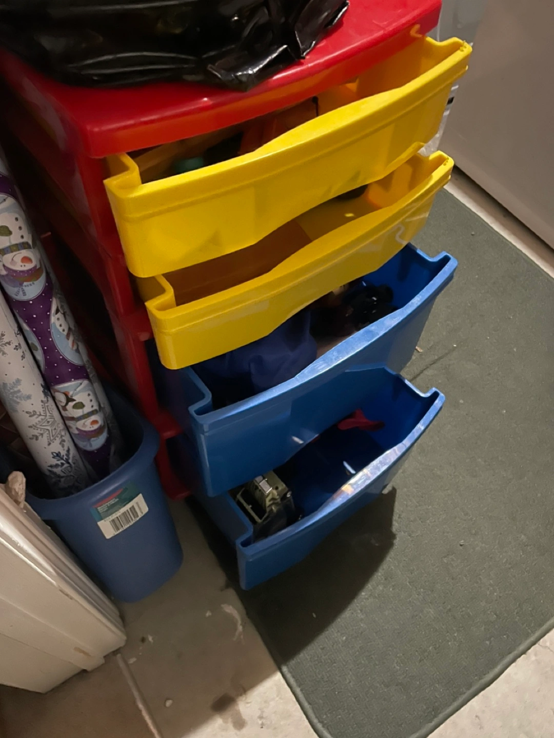 Four-drawer rolling storage unit. Bright colours, red, yellow, and blue drawers. Plastic construction. Great for organizing small items.